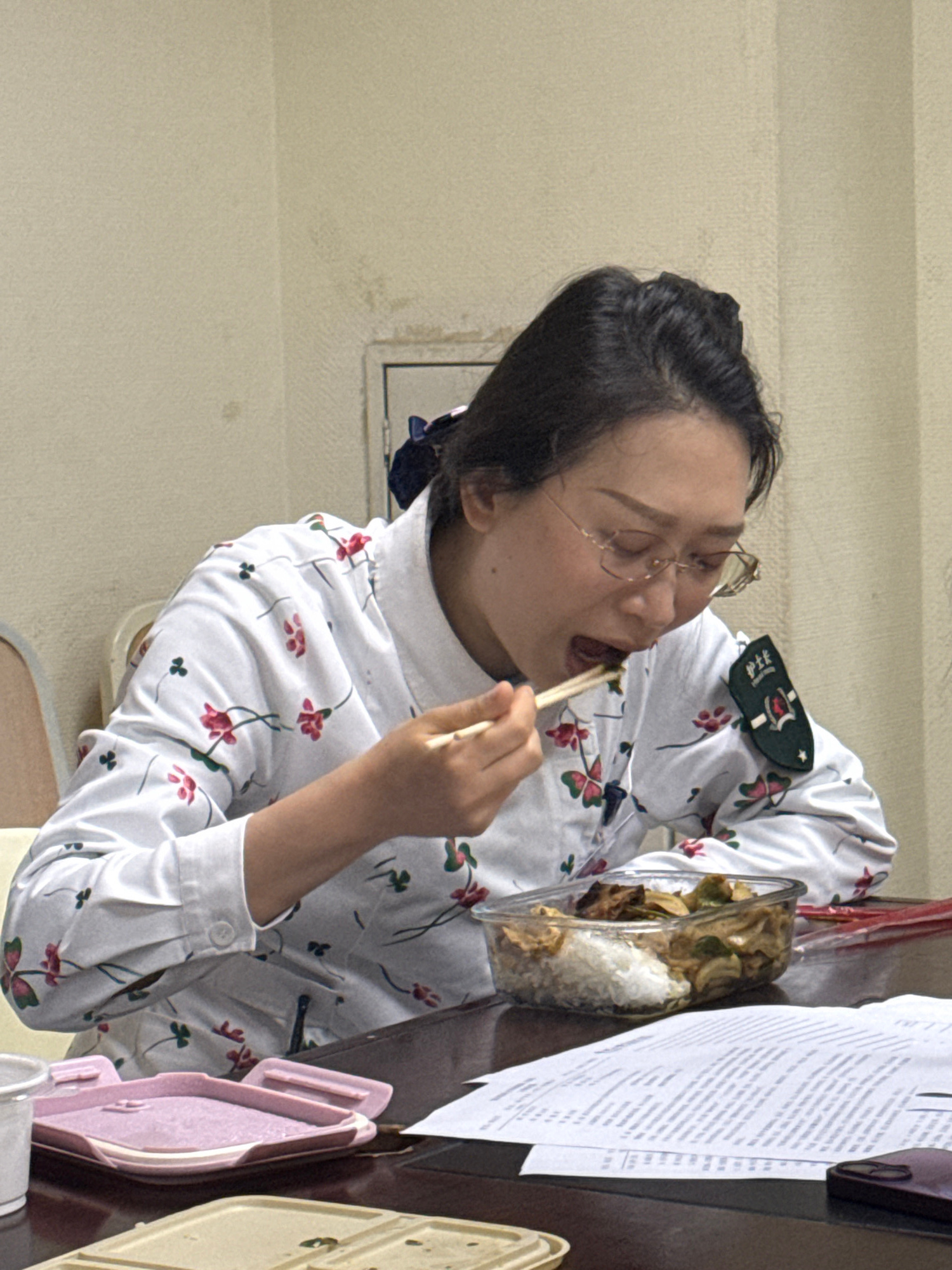 A woman with black hair and glasses is eating from a clear container with chopsticks. She is wearing a white shirt with a floral pattern and a green patch on her shoulder. The container appears to hol…read more