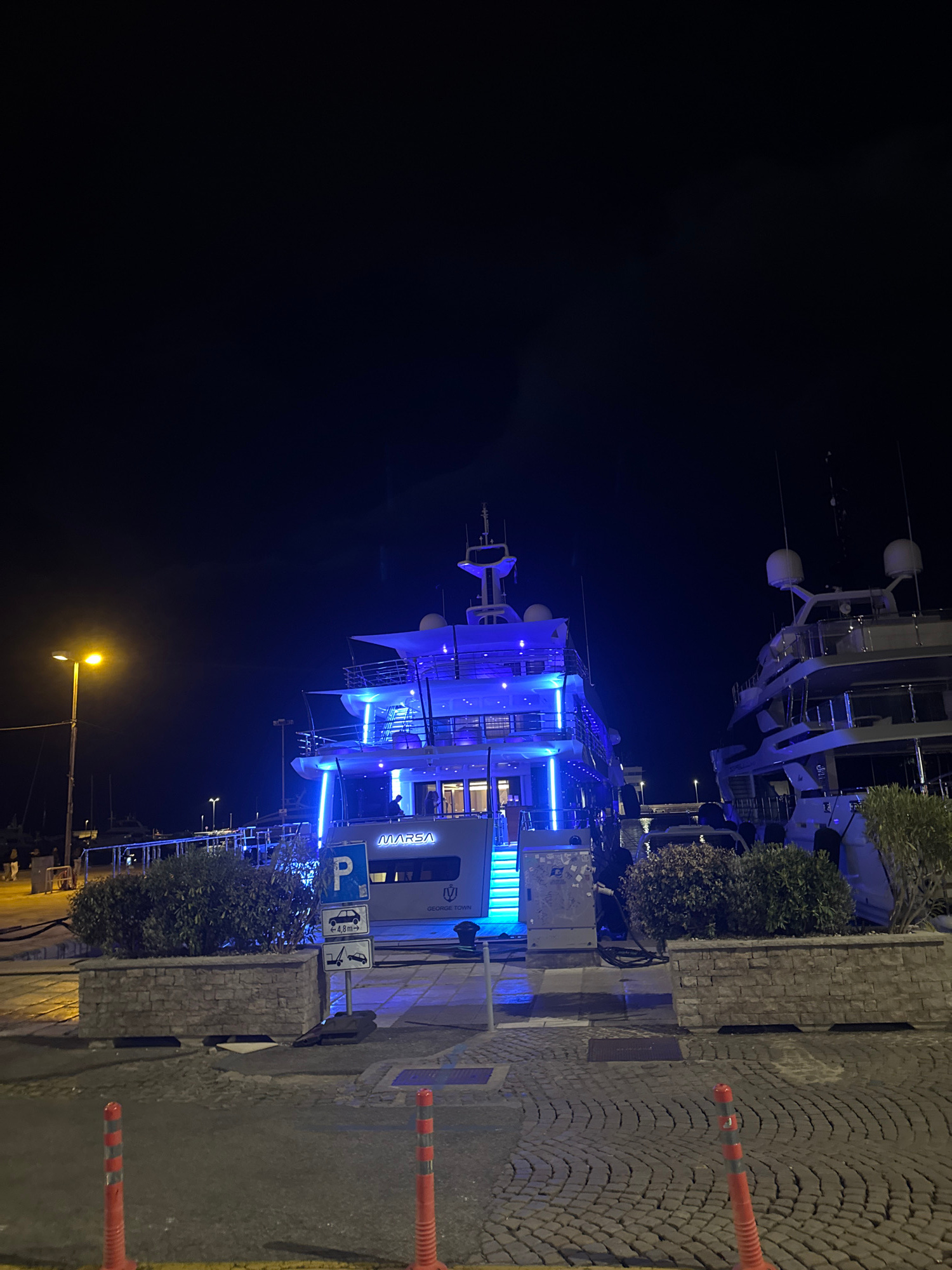 At night in Grad Rijeka, Croatia, a large illuminated yacht is docked along the waterfront. The yacht is lit with blue lights. Several smaller boats and yachts are docked in the background. A street l…read more