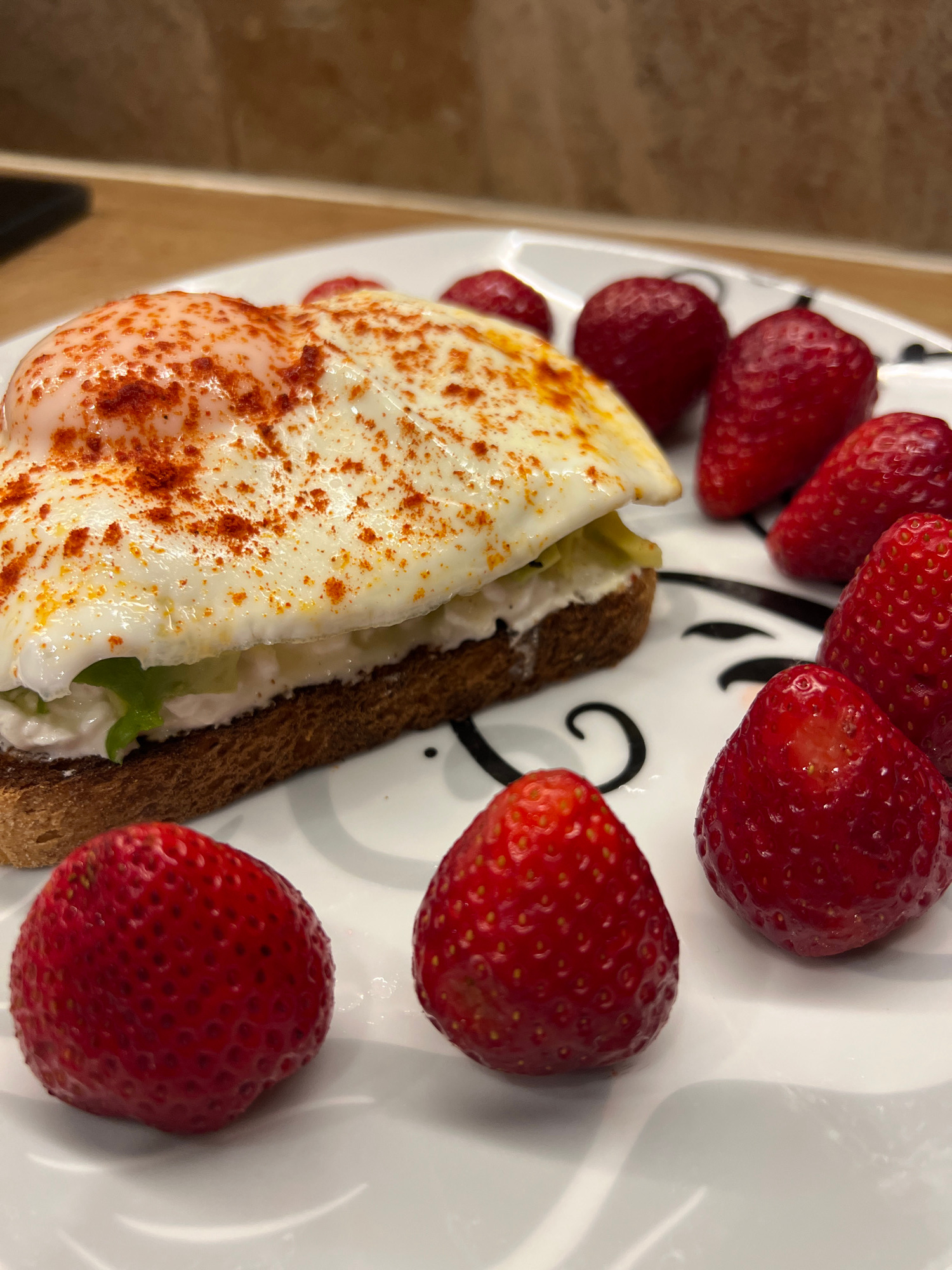 A top-down, close-up shot shows a white plate decorated with black, stylized swirls. Arranged on the plate are several fresh strawberries and a piece of dark toast topped with a fried egg and a white…read more