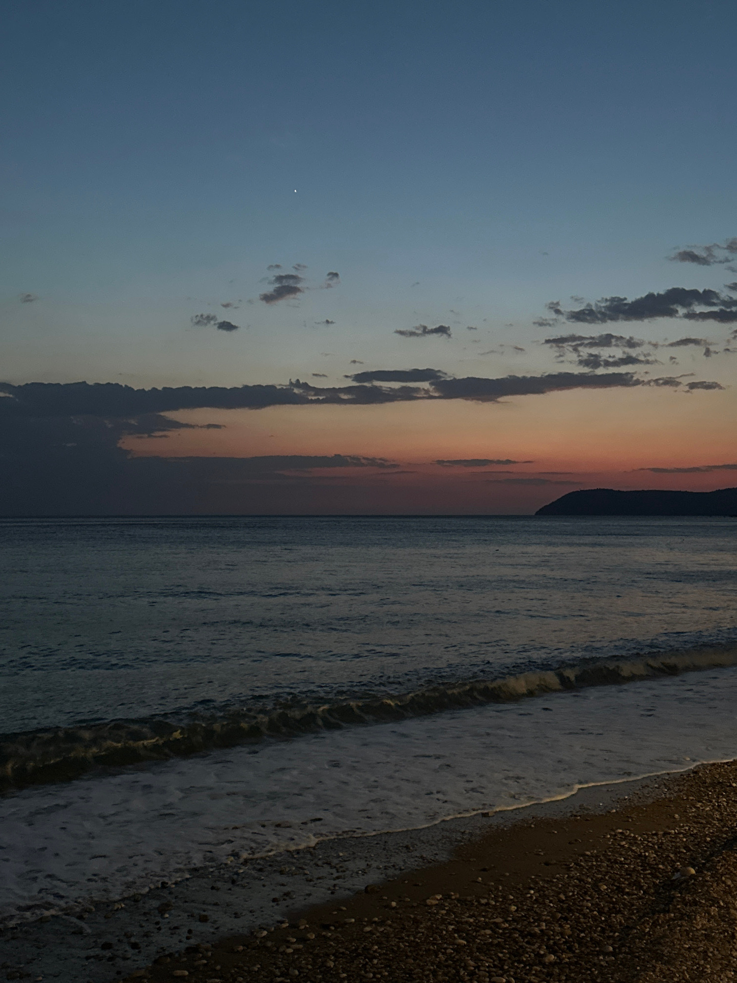 The image depicts a coastline at twilight. In the upper-left quadrant is a darkening blue sky with wispy clouds. A thin crescent moon is visible. Moving to the right, the sky transitions into shades o…read more
