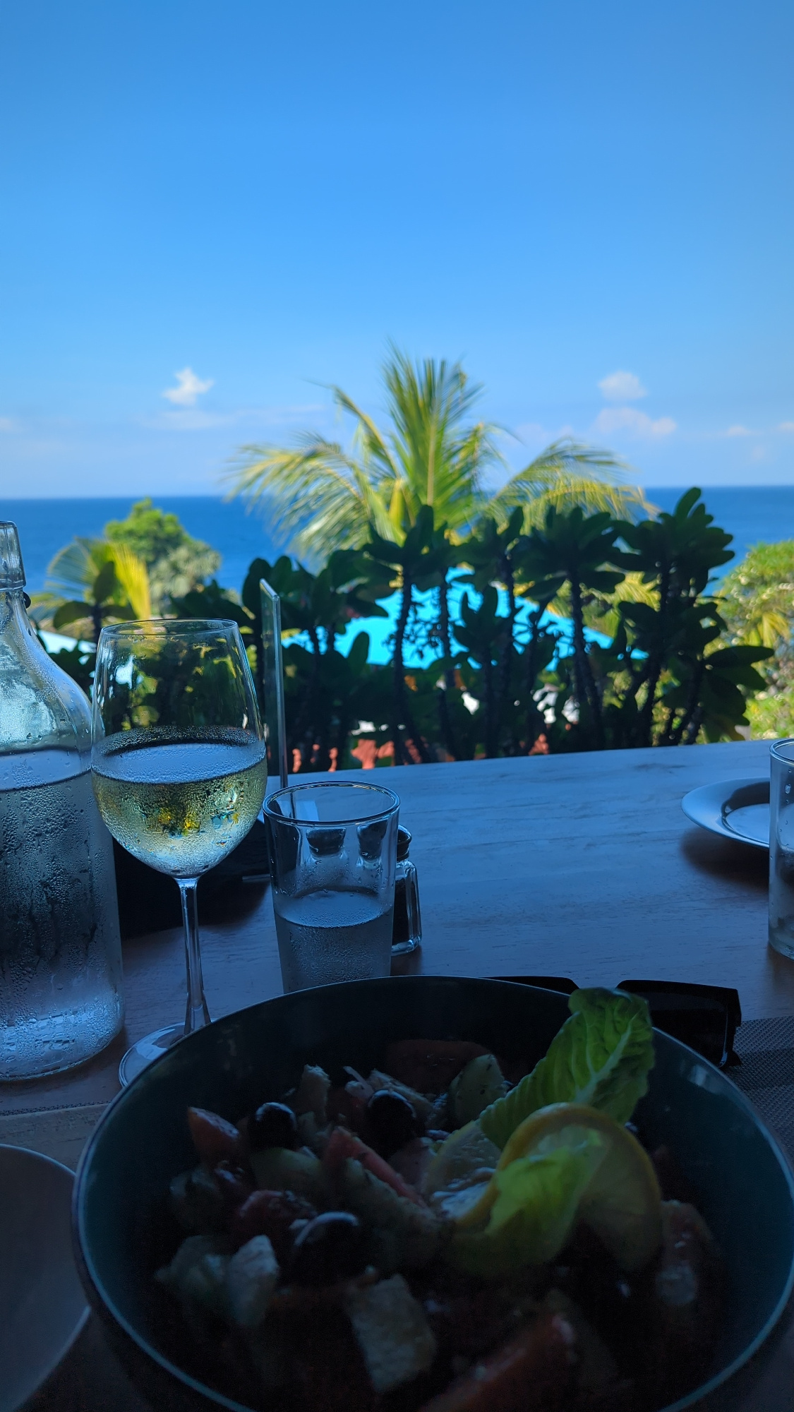 The image depicts an outdoor dining scene in what appears to be Abang, Indonesia, characterized by a view of the ocean and lush tropical vegetation including palm trees. A table setting includes a bow…read more