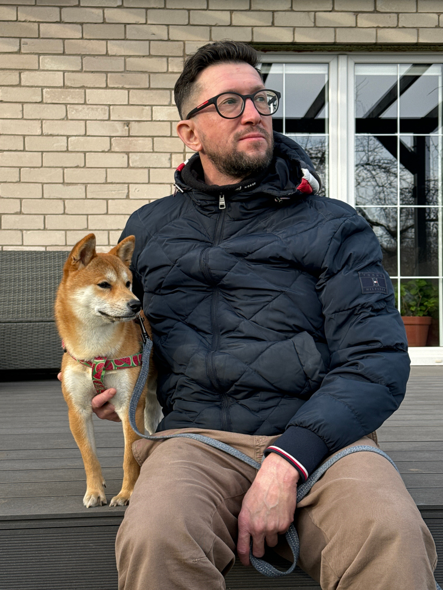 A man with glasses sits outside a building with a window. He is wearing a dark blue quilted jacket and khaki pants. He holds a Shiba Inu dog with a watermelon-patterned harness in his arms. The locati…read more