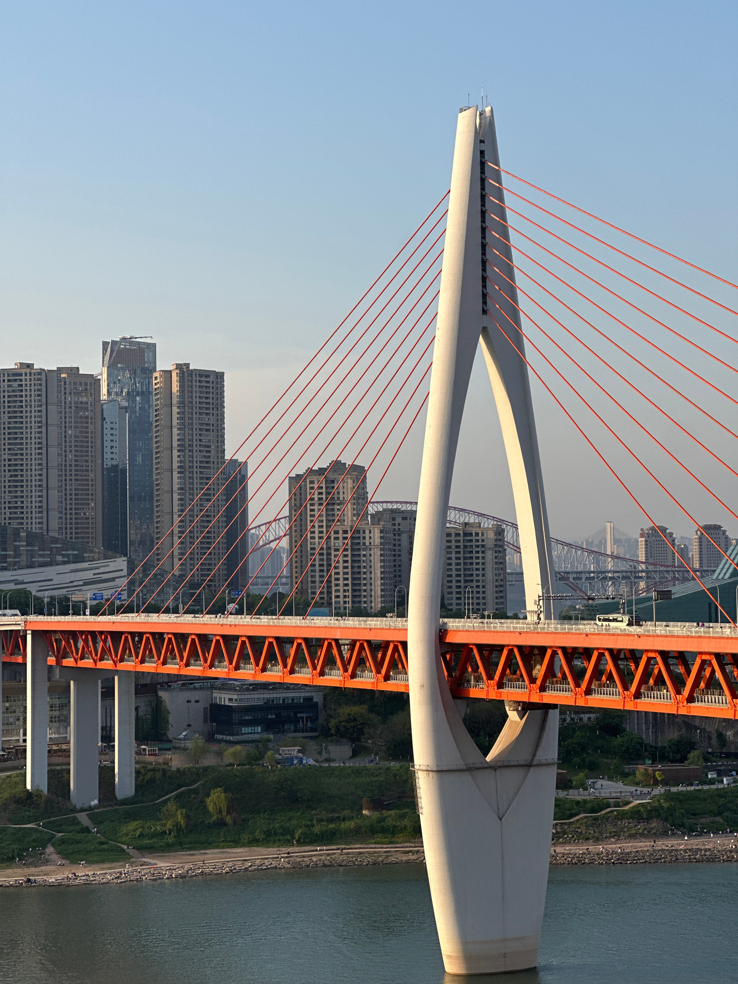 The image depicts a cable-stayed bridge in Yuzhong District, Chongqing, China. The bridge has a distinctive white A-frame tower and an orange bridge deck. Red cables connect the tower to the deck. A c…read more
