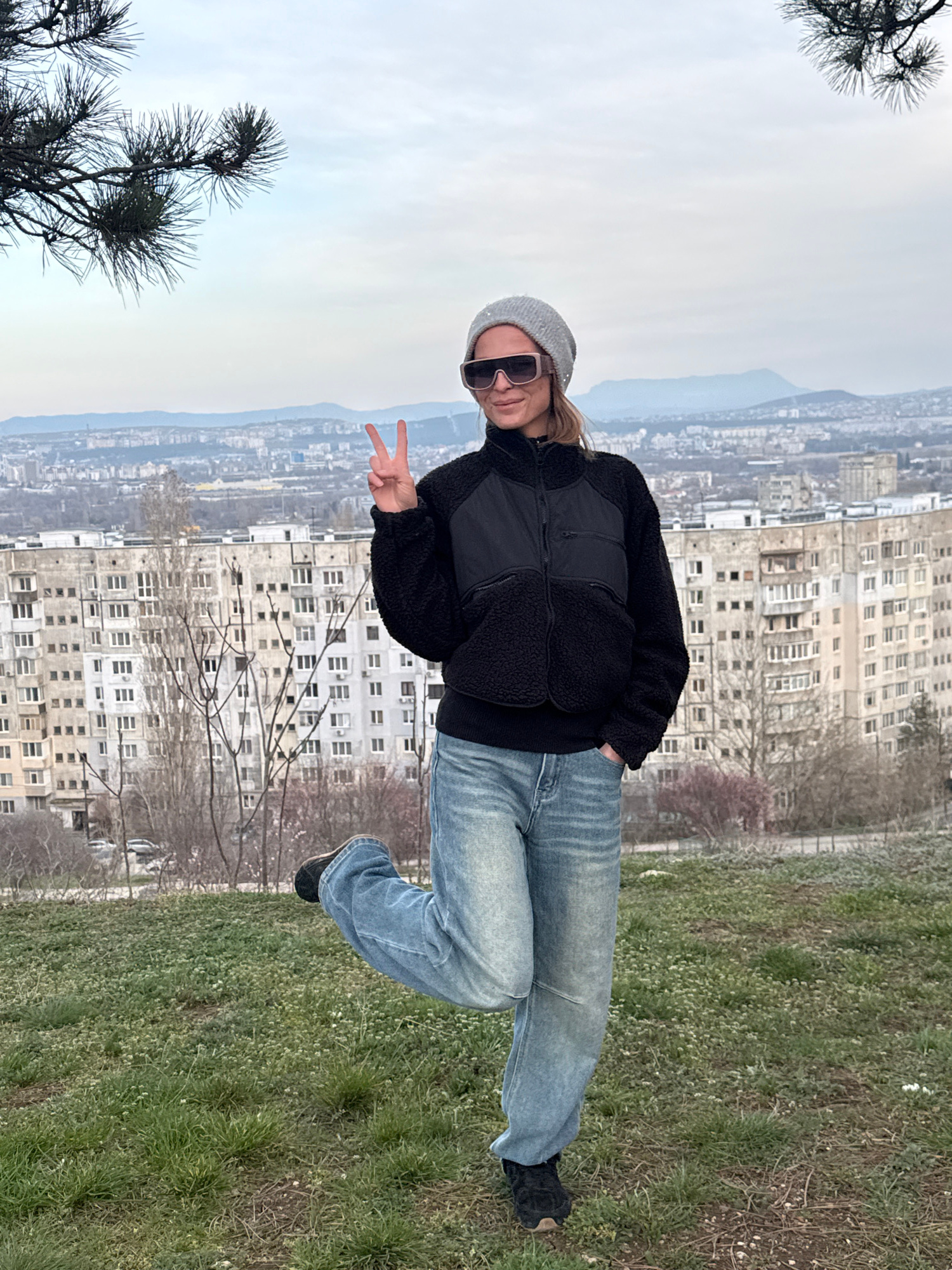 A woman stands on a grassy hillside, centrally framed, overlooking the city of Simferopol, Ukraine. She is positioned on her left leg with her right leg bent and raised, facing the viewer with a sligh…read more