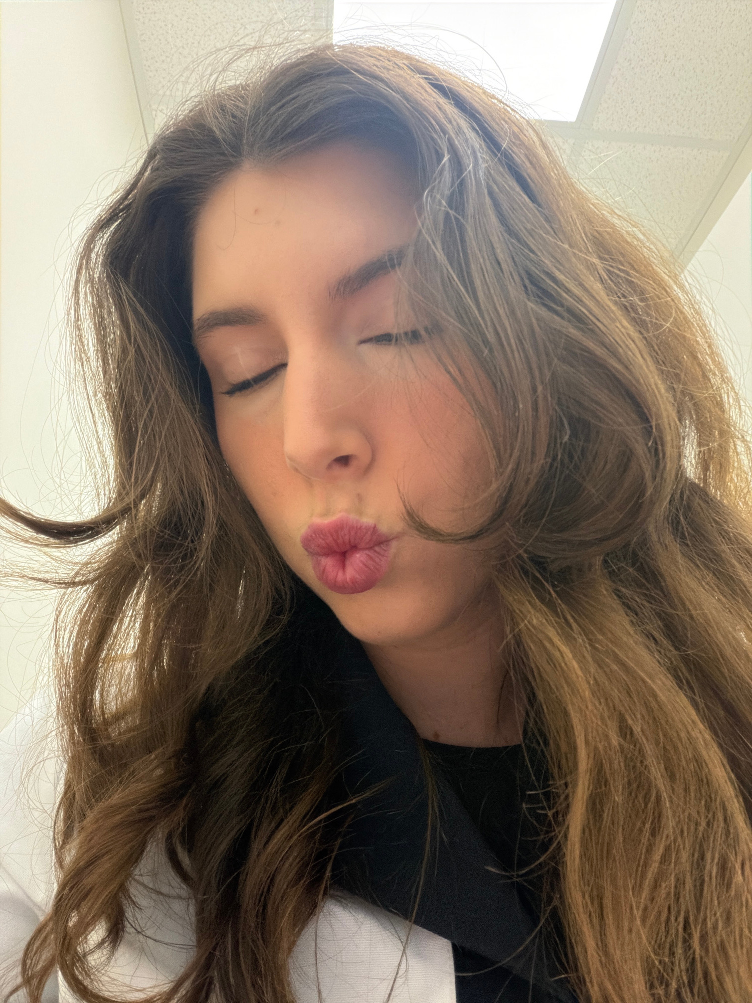 A person with long brown hair is lying down, with their eyes closed and lips pursed into a kiss. They are wearing a black shirt. The background includes a white wall and a window with a white frame. T…read more