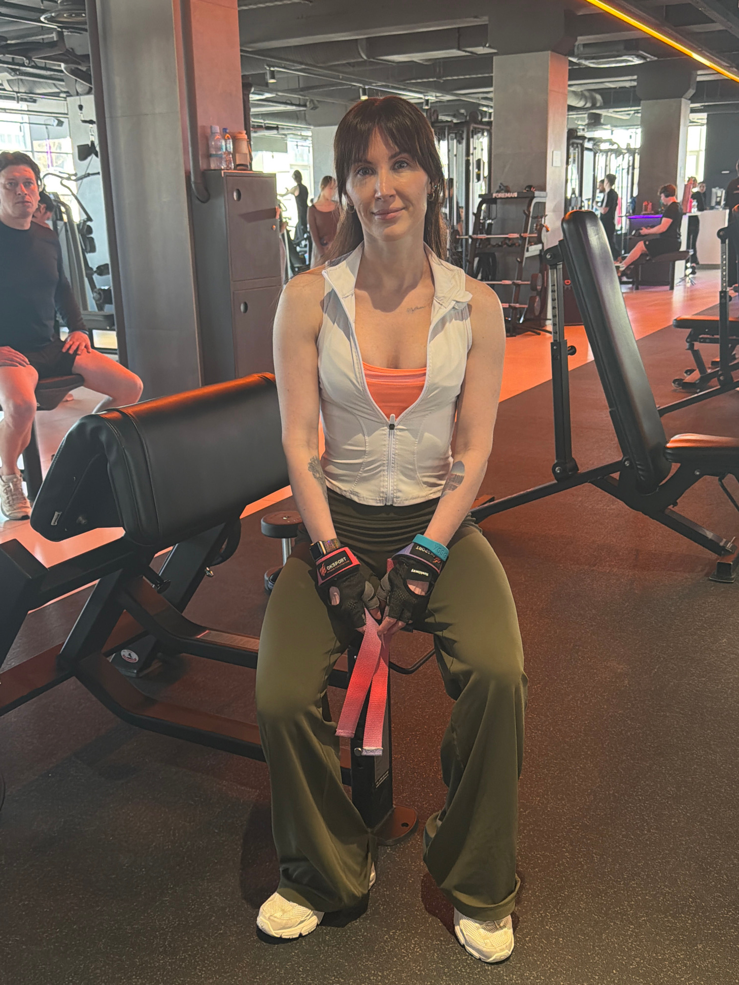 A woman is seated on a gym bench in what appears to be a fitness center in Perm, Russia. She wears a white athletic top, an orange undershirt, olive-green trousers, and white sneakers. She is holding…read more