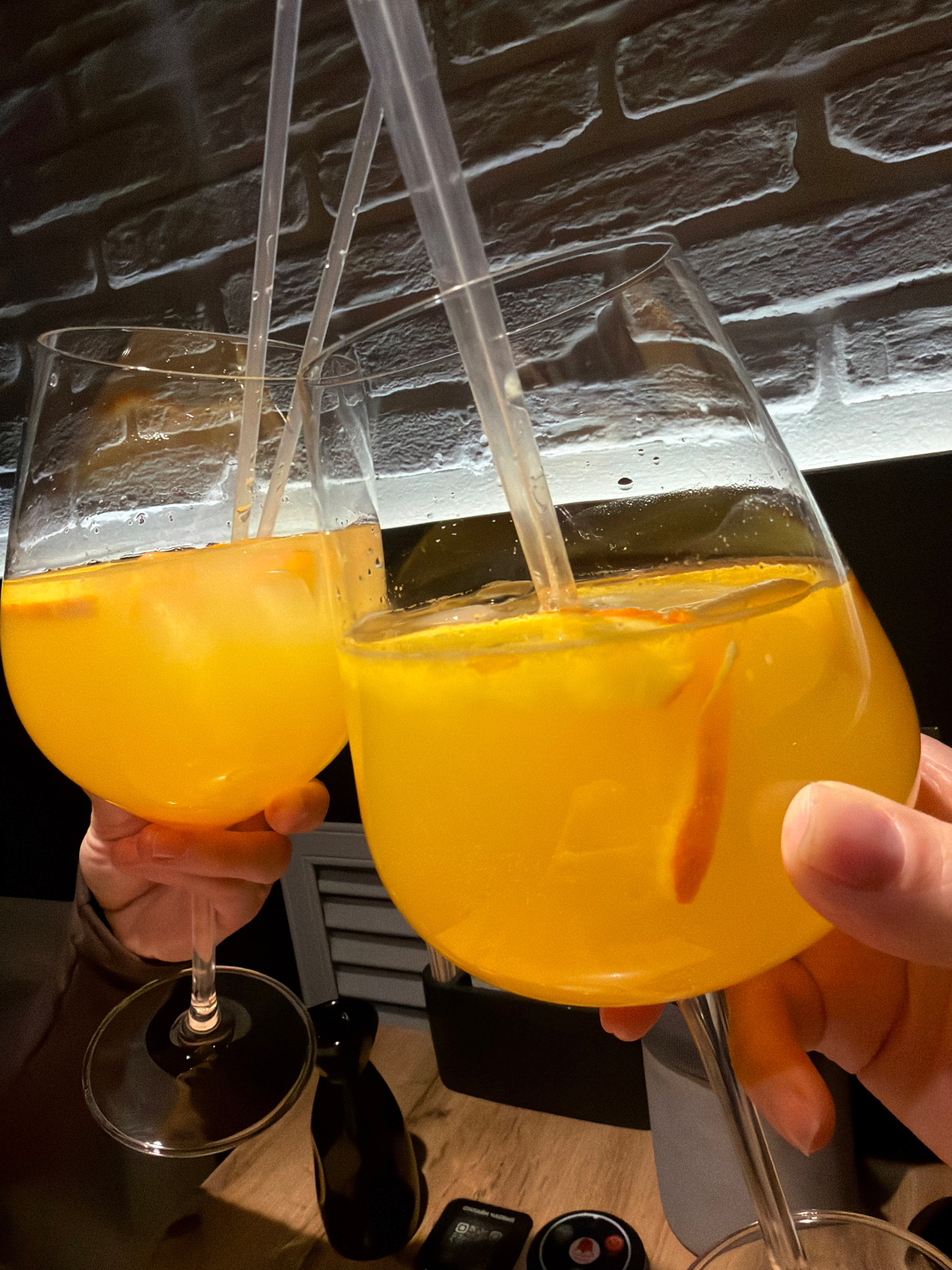 A person is pouring an orange-colored liquid from a large glass into another large glass, both containing straws and orange slices. The scene appears to be indoors. A brick-like patterned wall is visiβ¦read more
