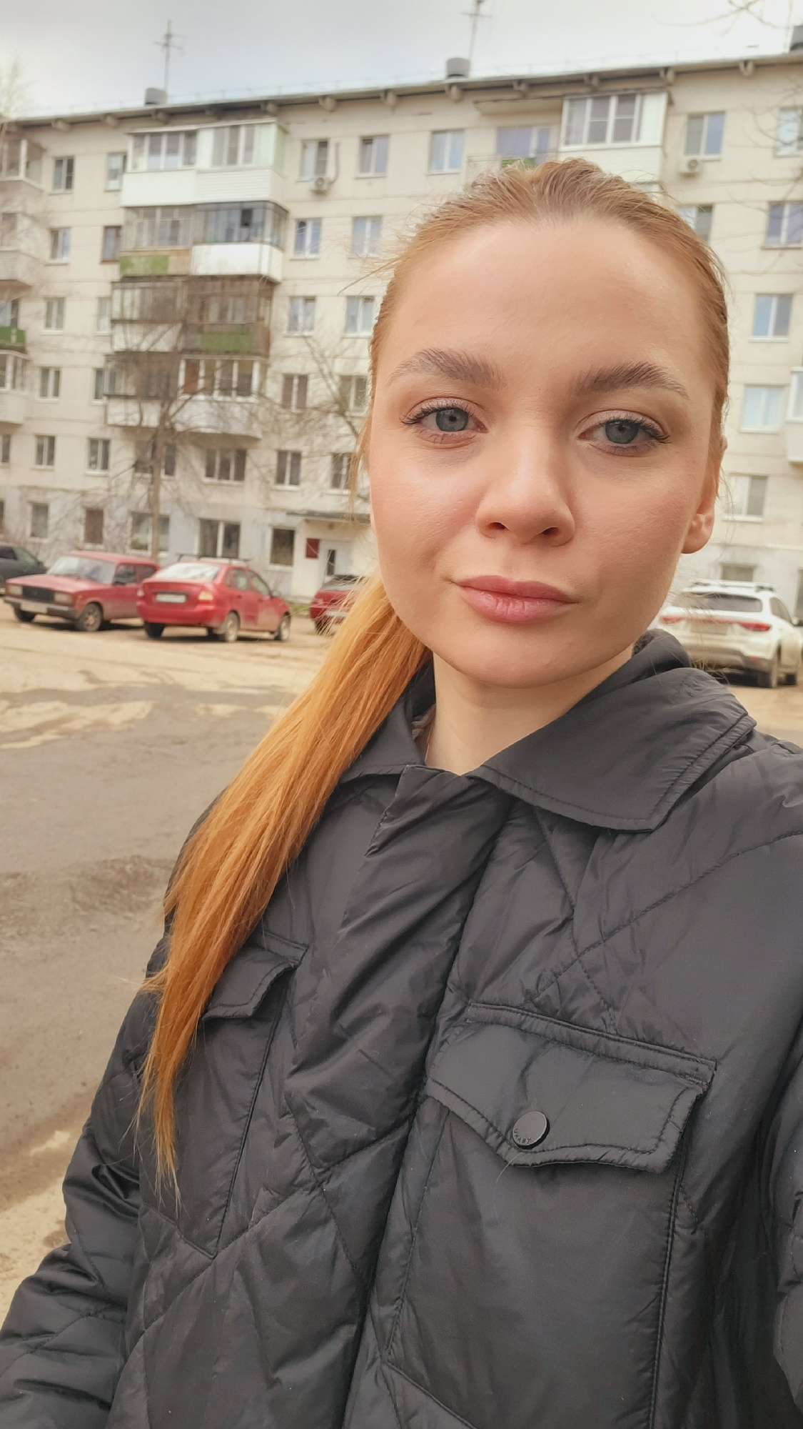 A selfie depicts a light-skinned woman with light blonde hair and blue eyes, positioned outdoors. She's wearing a black quilted jacket. The background reveals an urban environment with a multi-story b…read more