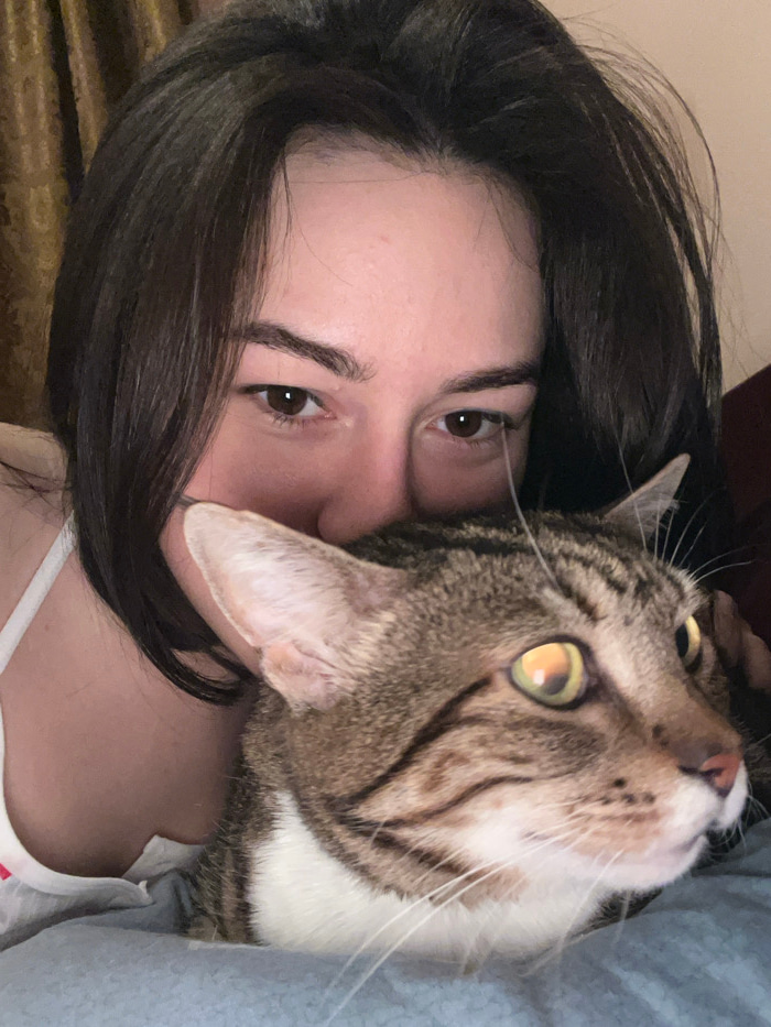 A woman with dark brown hair and brown eyes is pictured close-up, her face partially obscured by her hair and a cat. The cat is a tabby with white markings and yellow-green eyes, nestled closely to he…read more