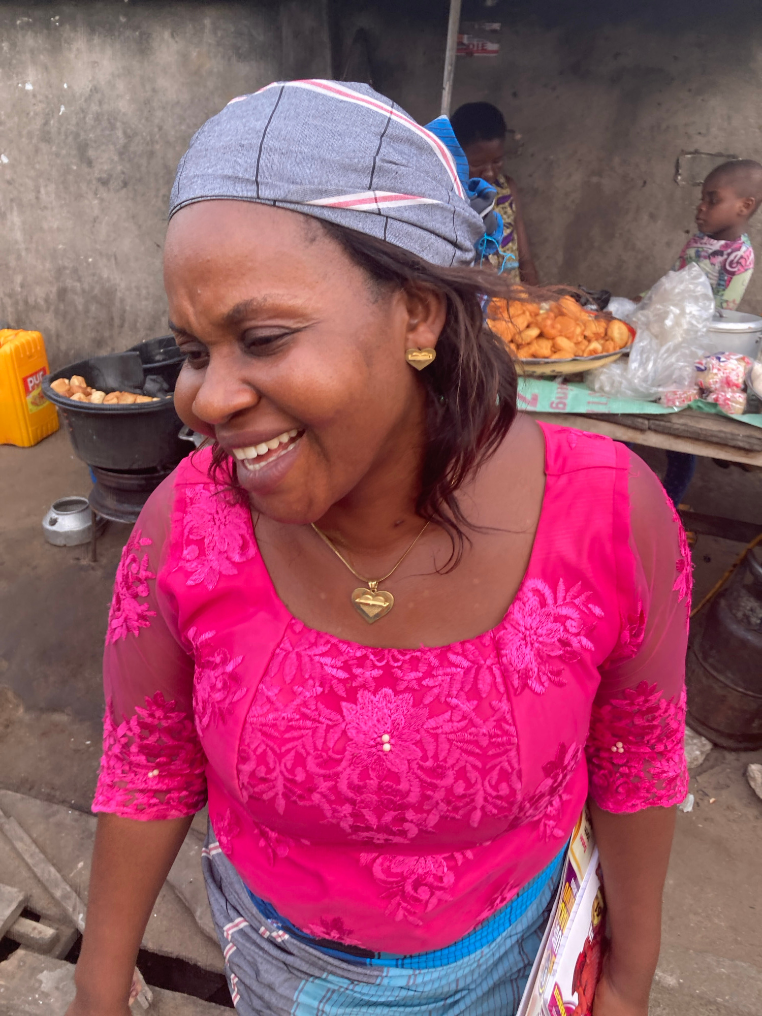 The image shows a woman smiling at the camera, wearing a pink lace top, a grey headscarf, and a heart-shaped necklace and earrings. She is standing near a pot of fried food and a yellow container labe…read more