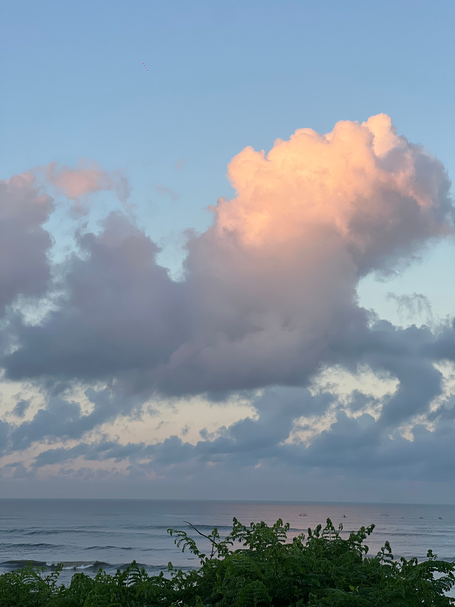 The image shows a coastal scene with a view of the ocean and sky. The sky is filled with clouds, some illuminated with a pinkish hue, possibly from the setting sun. The ocean appears calm with small w…read more
