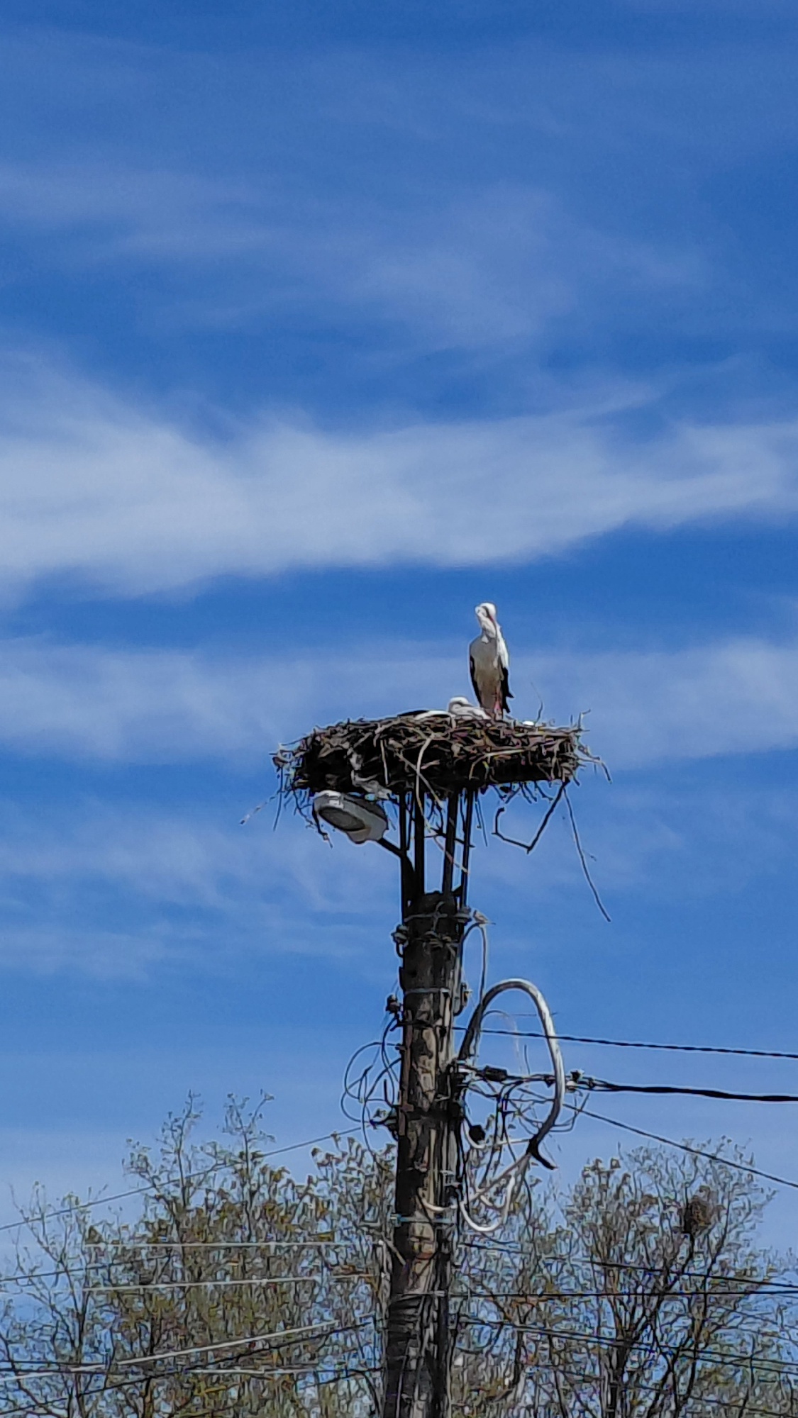 The image shows a bird's nest situated atop a utility pole against a blue sky with scattered white clouds. Inside the nest, at least one large bird, potentially a stork or similar species, is visible.…read more