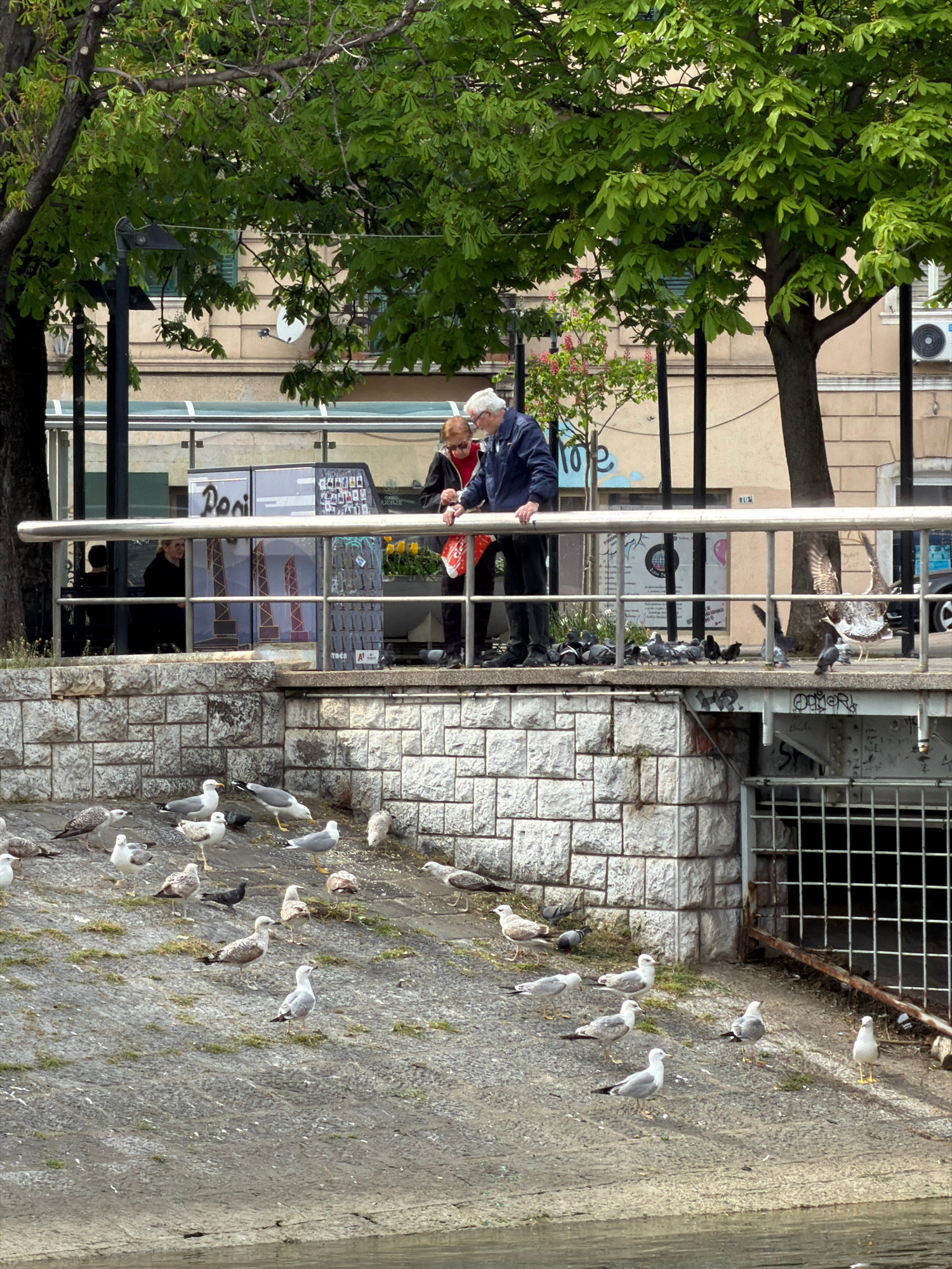 The image depicts a scene in the city of Grad Rijeka, Croatia, next to the Mrtvi Kanal (Dead Canal). An elderly couple stands at a metal railing, likely interacting with the numerous seagulls and pige…read more