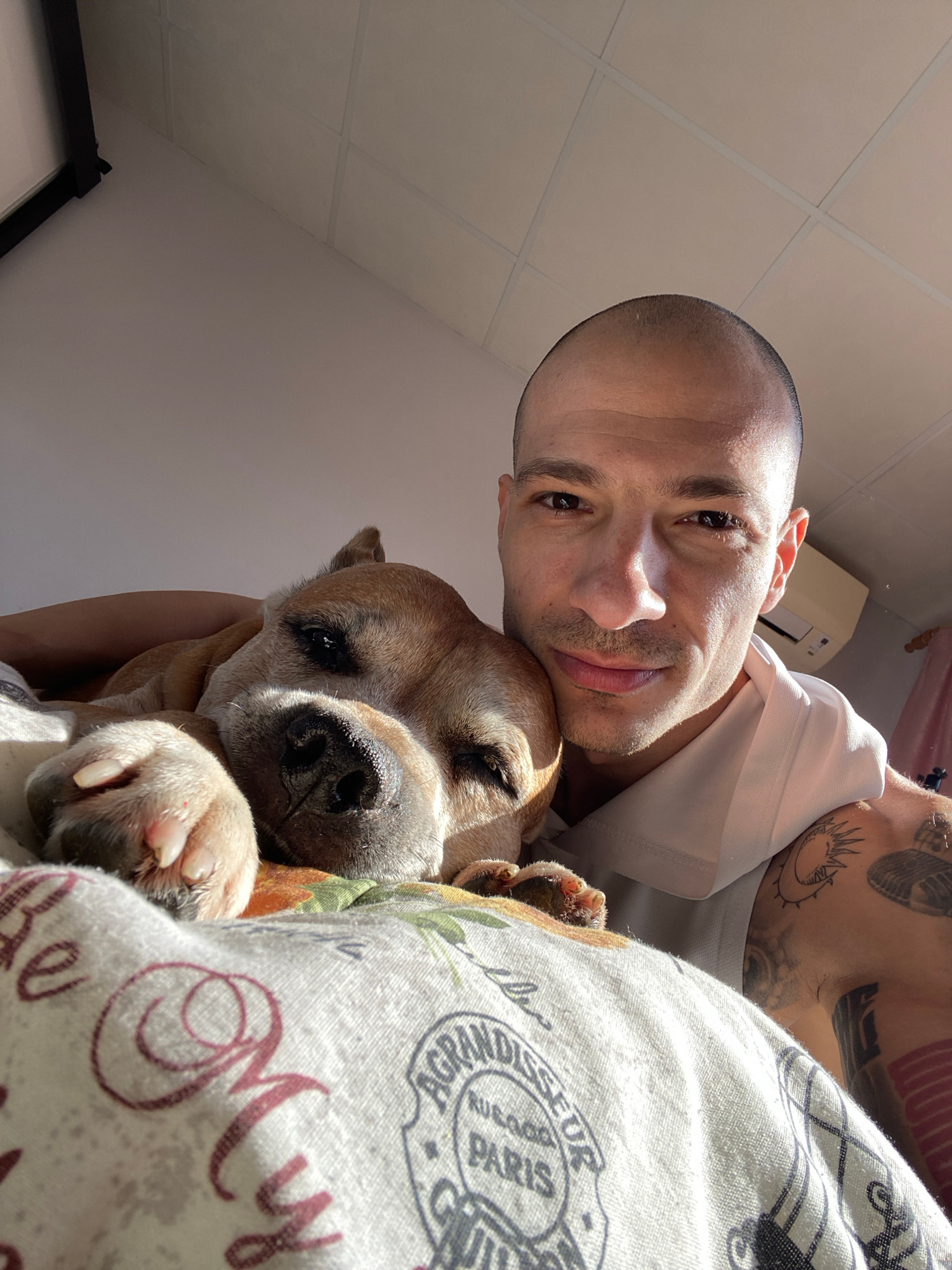 A man is lying down with his dog. The man has a shaved head and is wearing a white shirt. He has tattoos on his chest and arm. The dog is a brown and white pit bull. The dog is sleeping on the man's c…read more