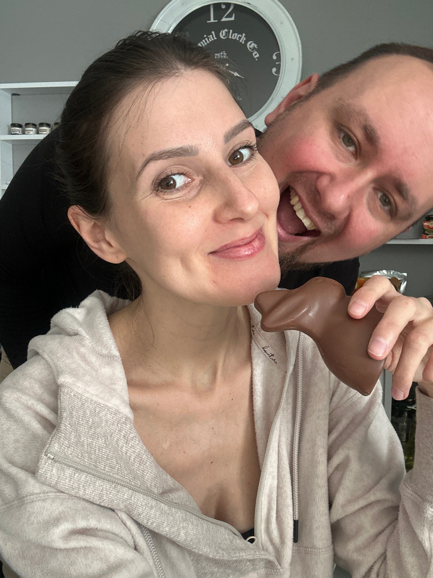 A selfie shows a Caucasian male holding a brown, chocolate, rabbit-shaped treat to the throat of a Caucasian female, both smiling. The man has short dark hair, while the woman has dark hair pulled bac…read more