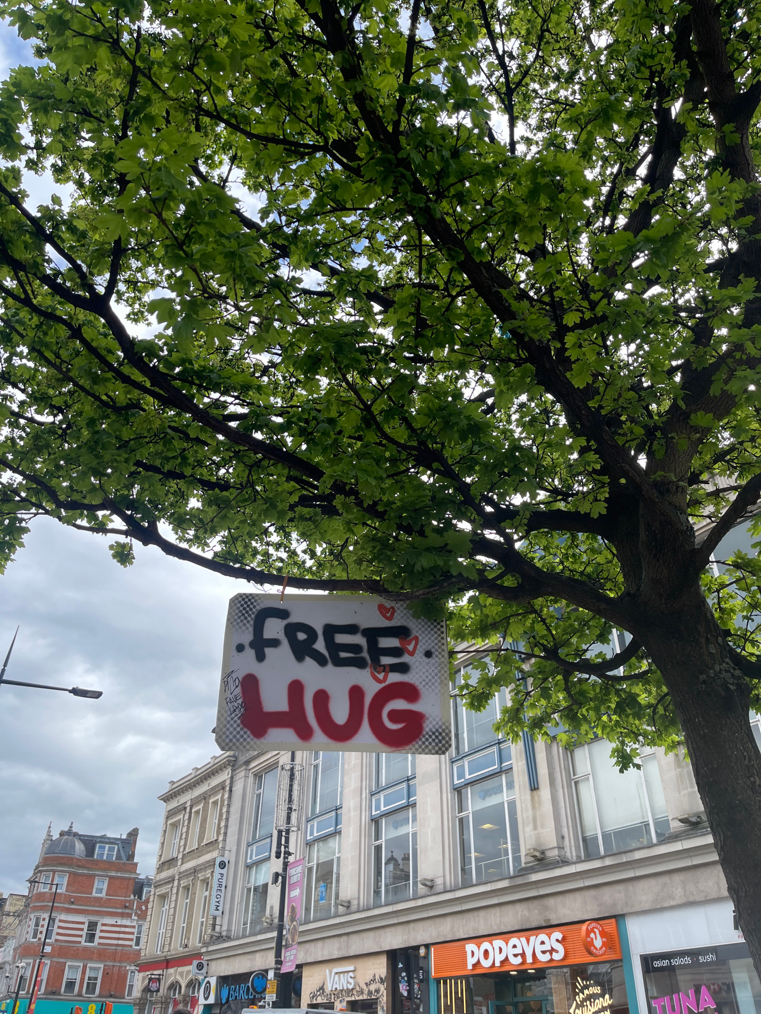 The image captures an upward view of a bustling urban street scene in London, UK, dominated by a large tree in the foreground. The tree features a dense canopy of bright green leaves and dark, sturdy…read more