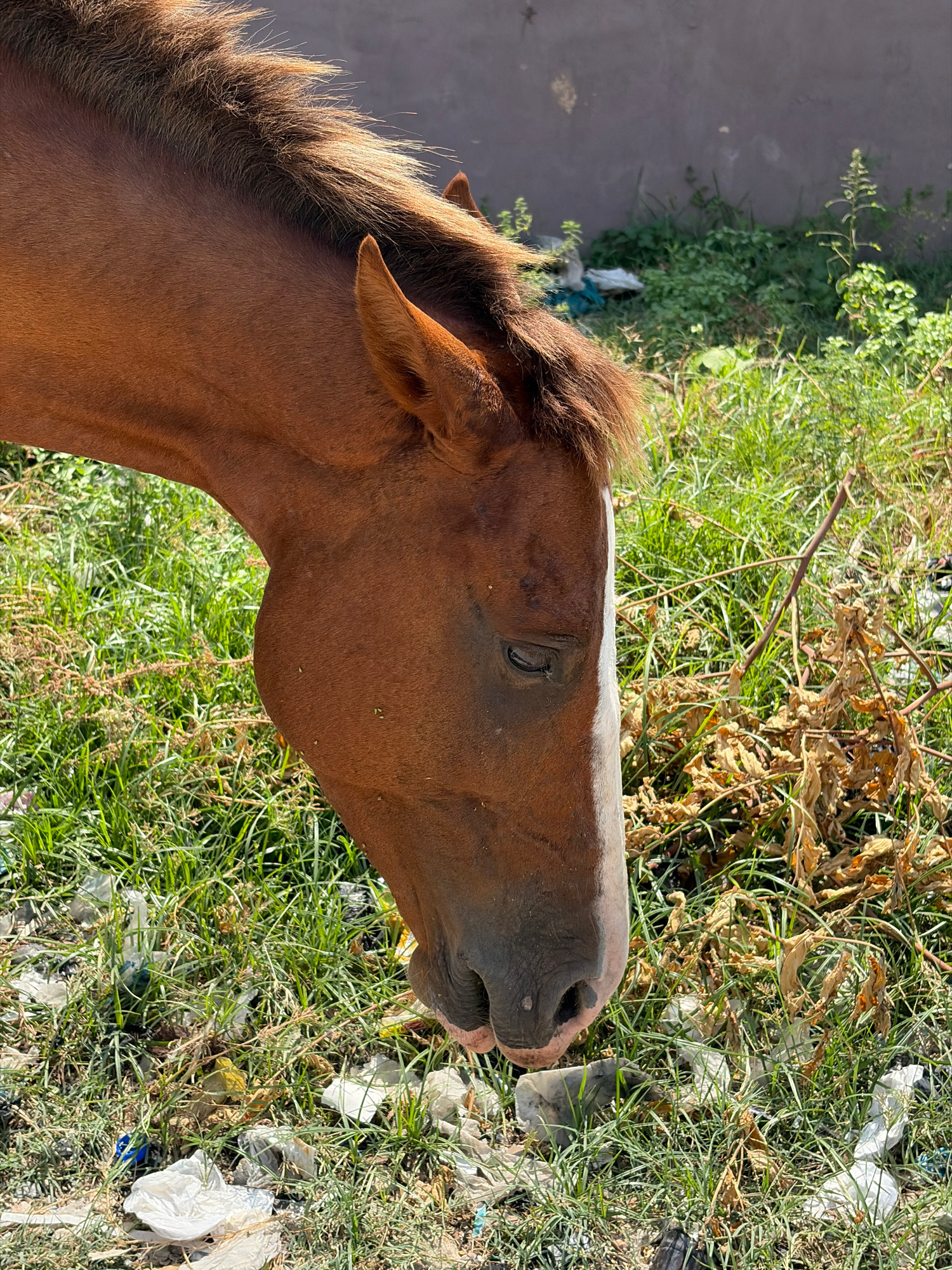 A close-up, medium-shot depicts a brown horse's head with a white stripe down its face, grazing in an area overgrown with green grass, dry leaves, and scattered white plastic trash. The horse's muzzle…read more