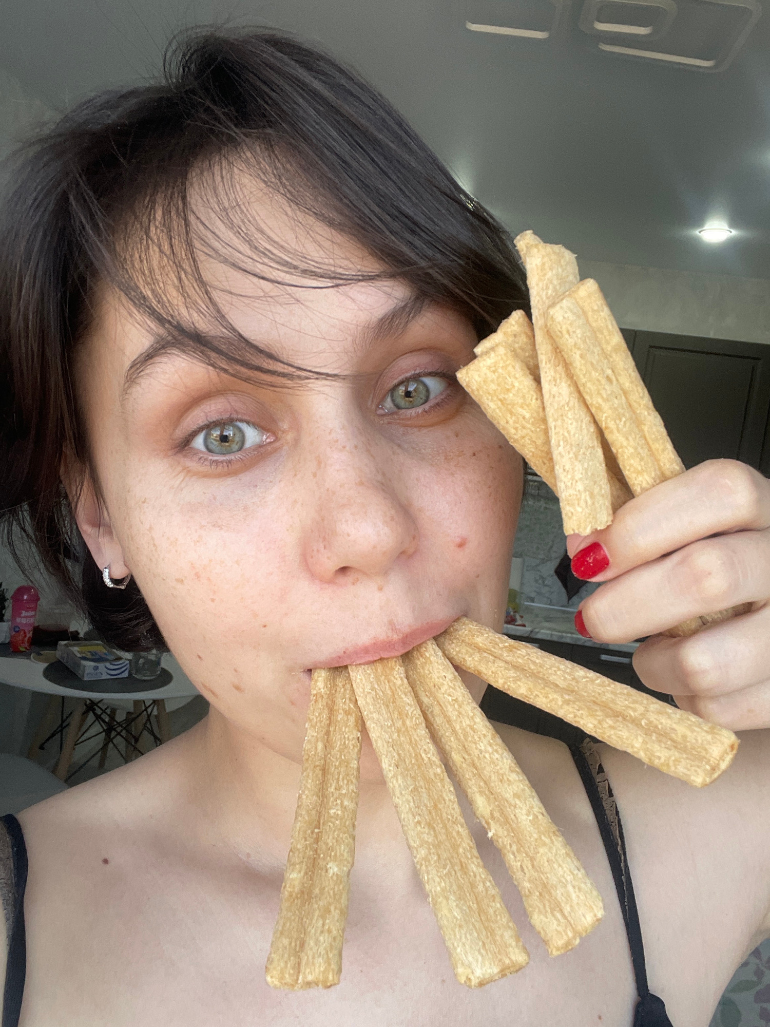 A woman with brown hair and light eyes is shown in a close-up shot. She is holding and placing several tan, rectangular objects, possibly food items, in her mouth. Her fingernails are painted red. Par…read more