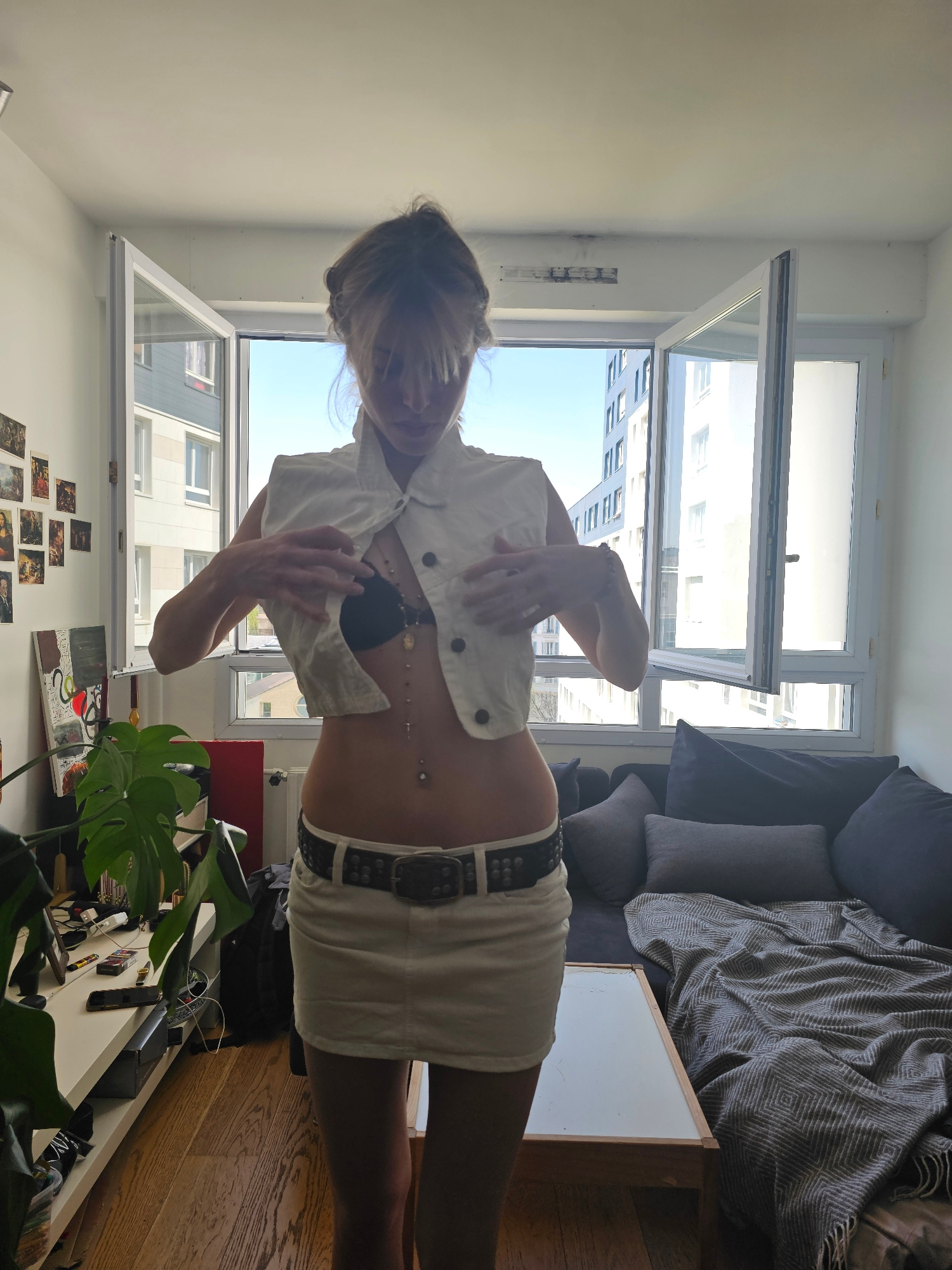 A waist-up shot depicts a woman in a white outfit in an indoor setting. The woman, fair-skinned with blonde hair, wears a cropped white button-up vest and a short white skirt with a studded belt. Her…read more