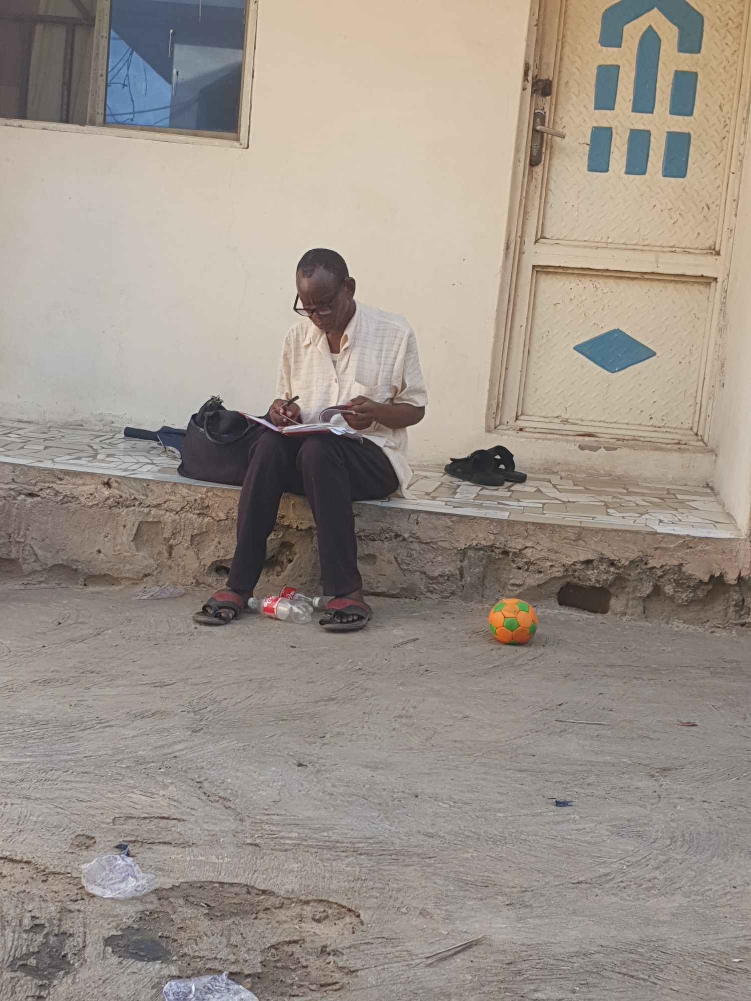 The image shows a man in Lokoja, Nigeria, sitting in a narrow space between a building and a concrete walkway. The man is wearing glasses, a light-colored, short-sleeved shirt, and dark pants with san…read more