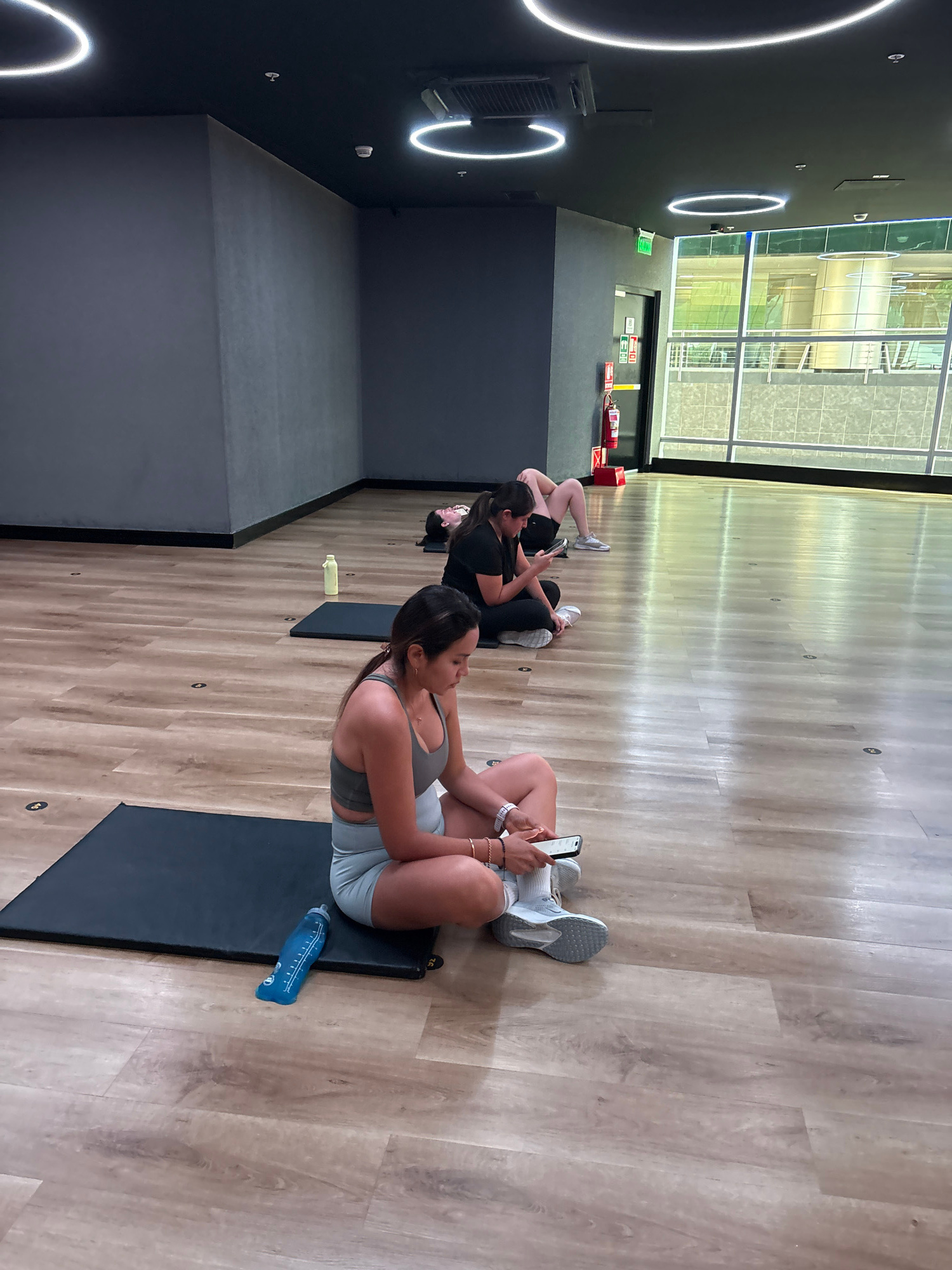 This image depicts an indoor fitness studio or gym located in San Isidro, Peru, during what appears to be daytime, judging by the natural light from the windows. The room features a modern design with…read more
