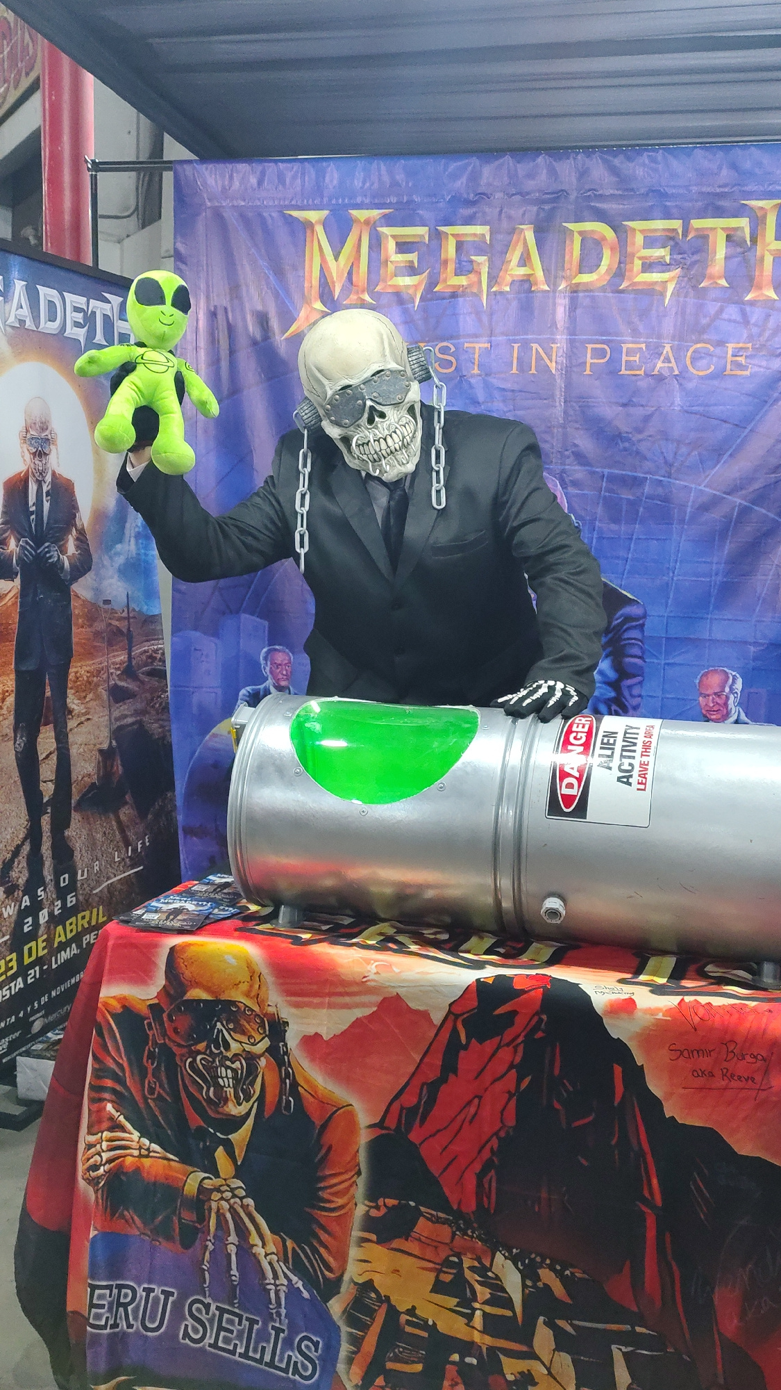 The image captures a merchandise display, possibly at a convention or market, featuring items related to the heavy metal band Megadeth. A Megadeth banner is displayed, featuring the band's logo and th…read more