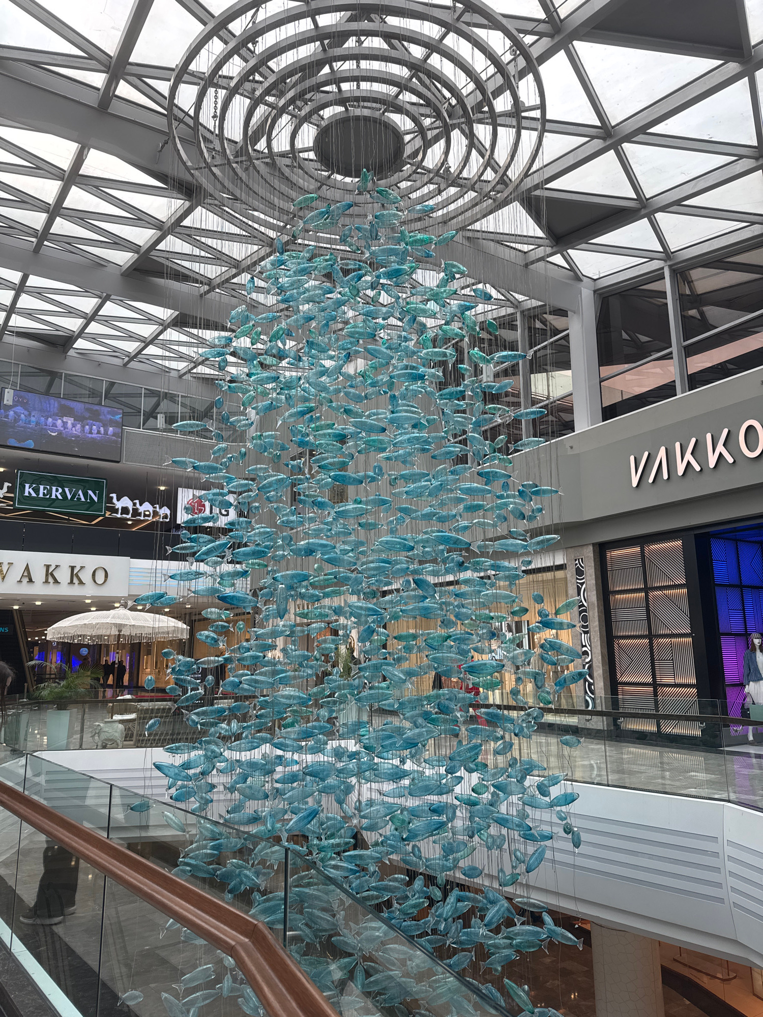 The image depicts the interior of a modern building, possibly a shopping mall, with a striking art installation. This mall is located in Bakırköy, Turkey, as indicated by the "VAKKO" and "KERVAN" sign…read more