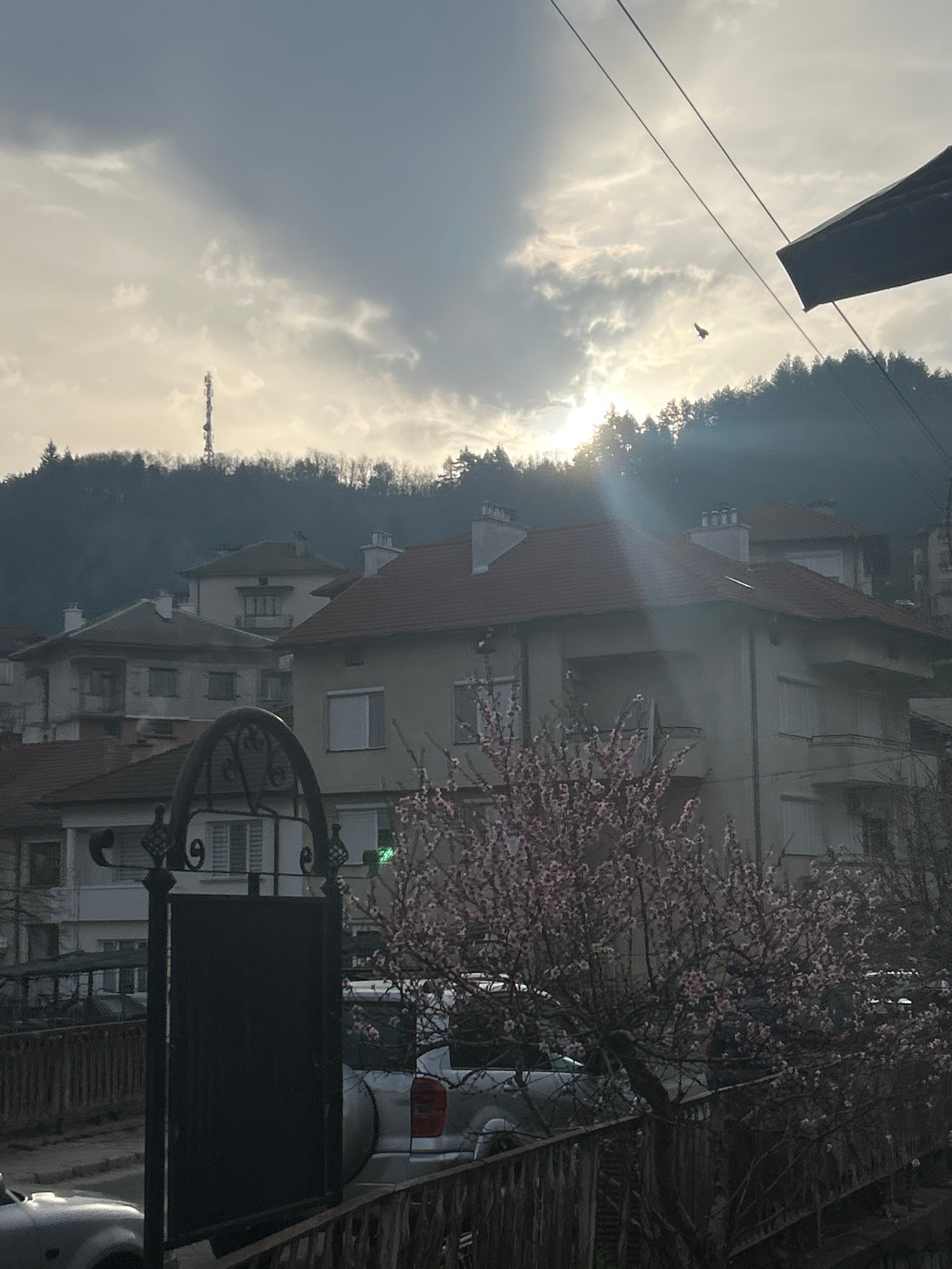 The image shows a view of a residential area in Zlatograd, Bulgaria. The setting is a street with houses on the right side. A blooming tree with pink flowers is prominent in the foreground, partially…read more