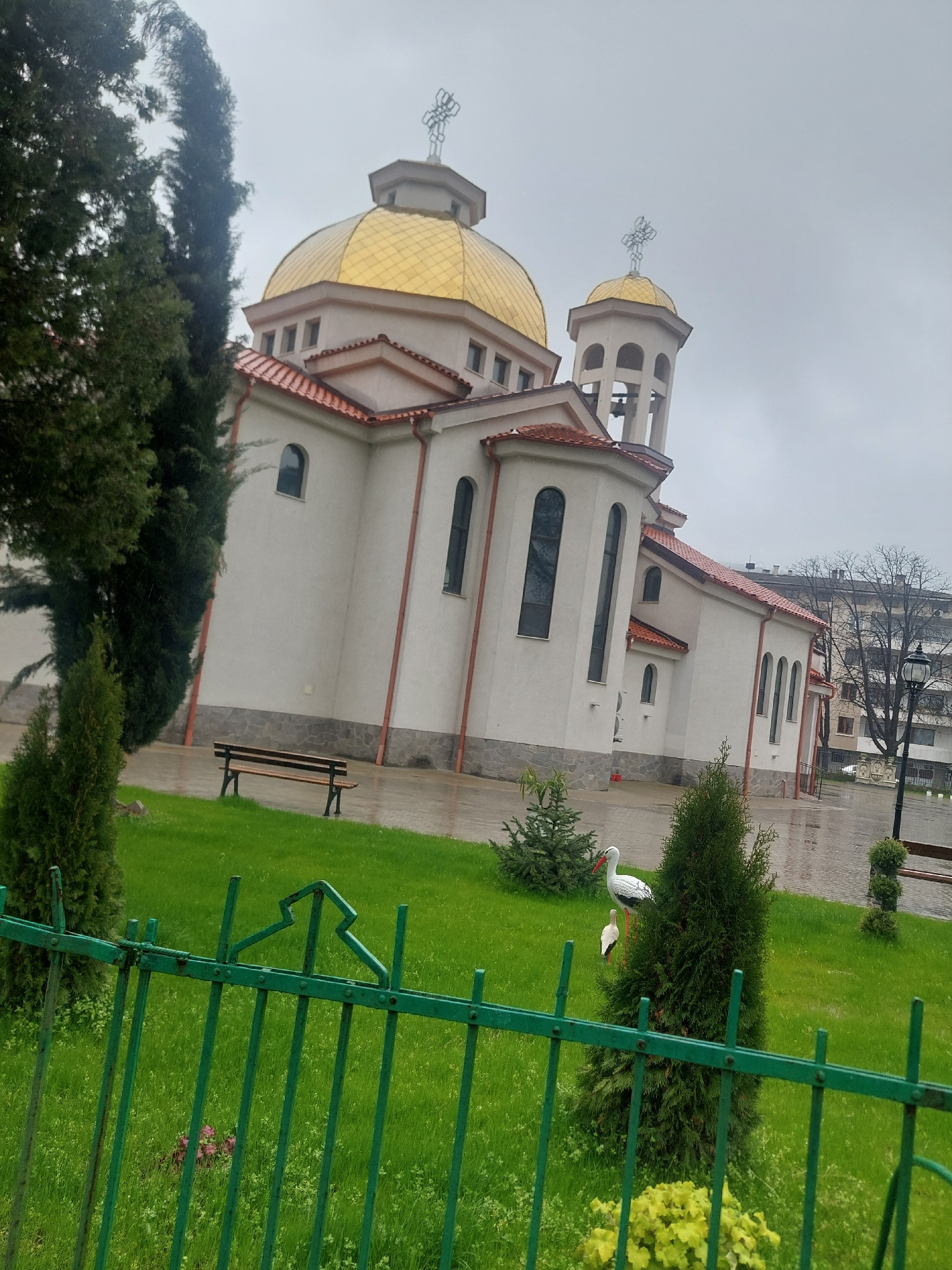 The image shows the Church of the Holy Mother of God in Asenovgrad, Bulgaria. The church has a white facade with a red roof and a golden dome. A green fence is in the foreground, and there are trees a…read more