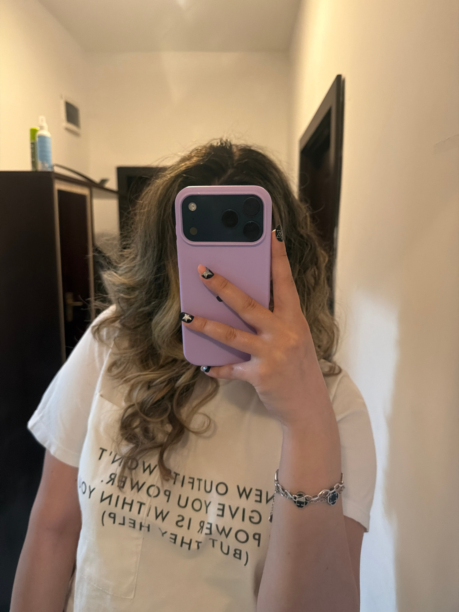 This image is a mirror selfie taken indoors in Plovdiv, Bulgaria. It features a person's right arm, hand, and the upper part of their head with long, wavy brown hair. The person is holding a light pur…read more