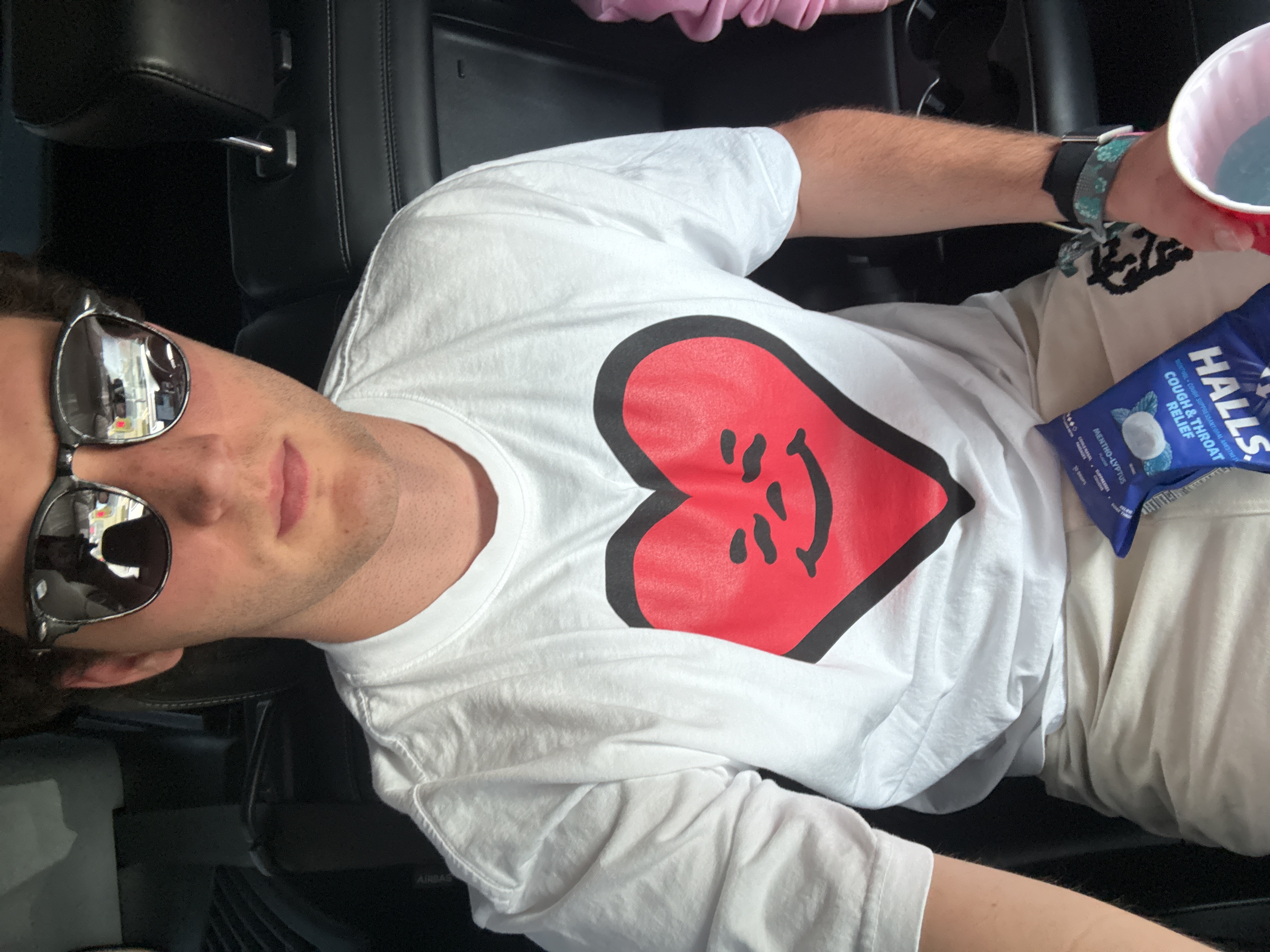 A young man sits in the passenger seat of a car. He wears sunglasses and a white T-shirt with a large red heart design. A blue packet of Halls cough drops rests on his lap. He holds a red plastic cup…read more