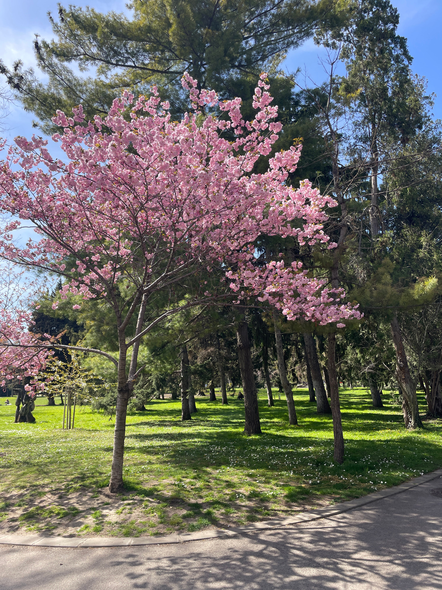 This image captures a vibrant and serene park scene on a sunny day, likely in Varna, Bulgaria, during springtime. The photograph, presented vertically, shows a lush landscape dominated by a large cher…read more
