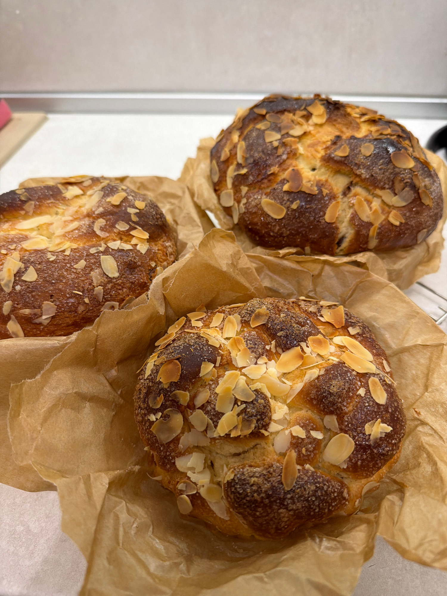 Three loaves of bread are arranged on a surface. The loaf on the right is nestled in crumpled brown paper. All three loaves are decorated with sliced almonds. The background shows a white surface, pos…read more