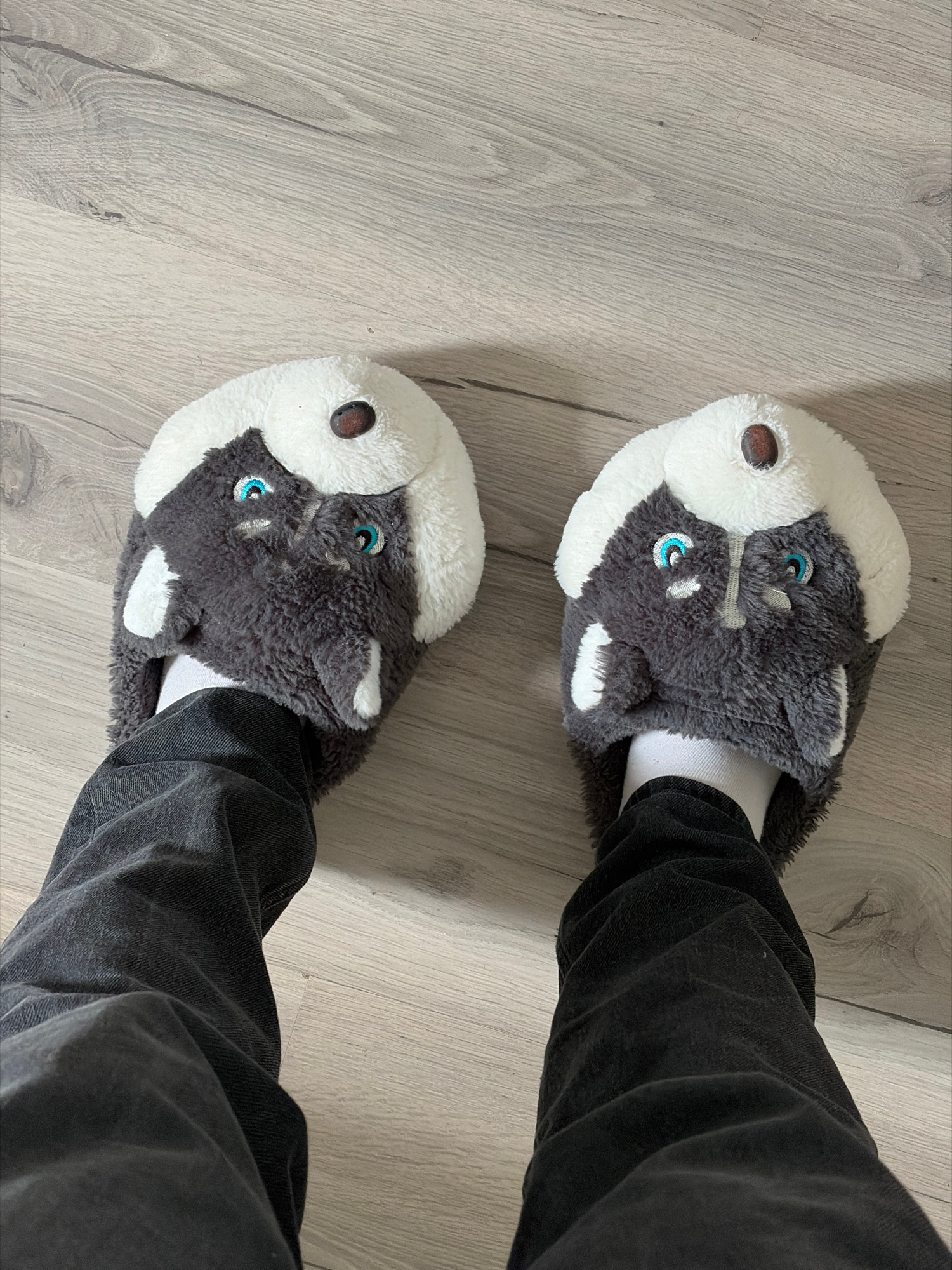 The image shows a person's feet wearing grey jeans and white socks, with badger-shaped slippers. The slippers are white and grey, with blue eyes and brown noses. The feet are resting on a light-colore…read more