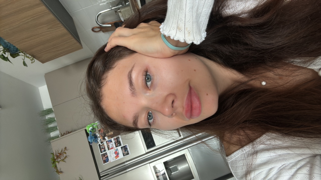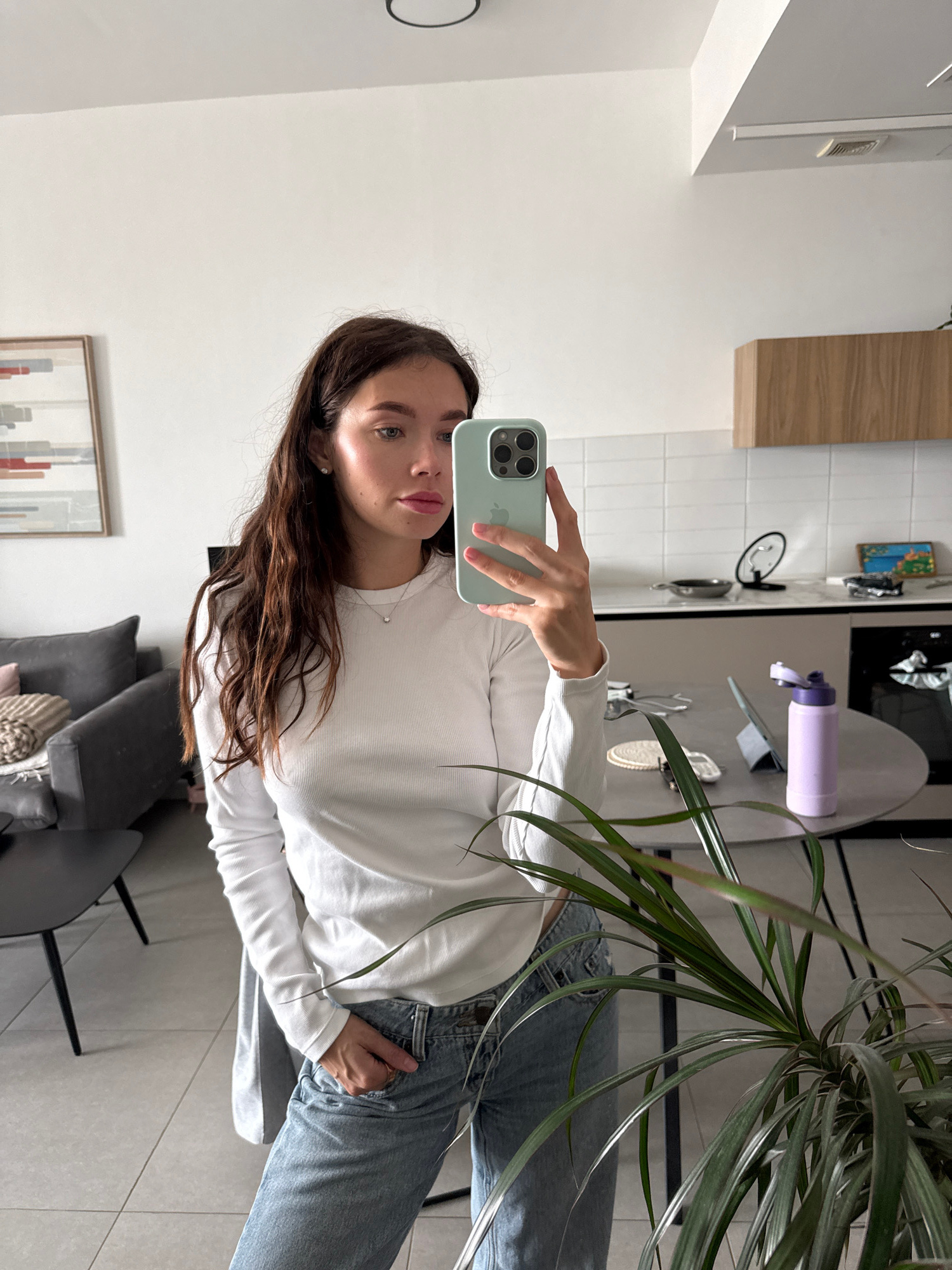 A young woman with long brown hair is taking a selfie with a green iPhone. She is wearing a white long-sleeved shirt and blue jeans. She is standing in a modernly decorated apartment. In the backgroun…read more
