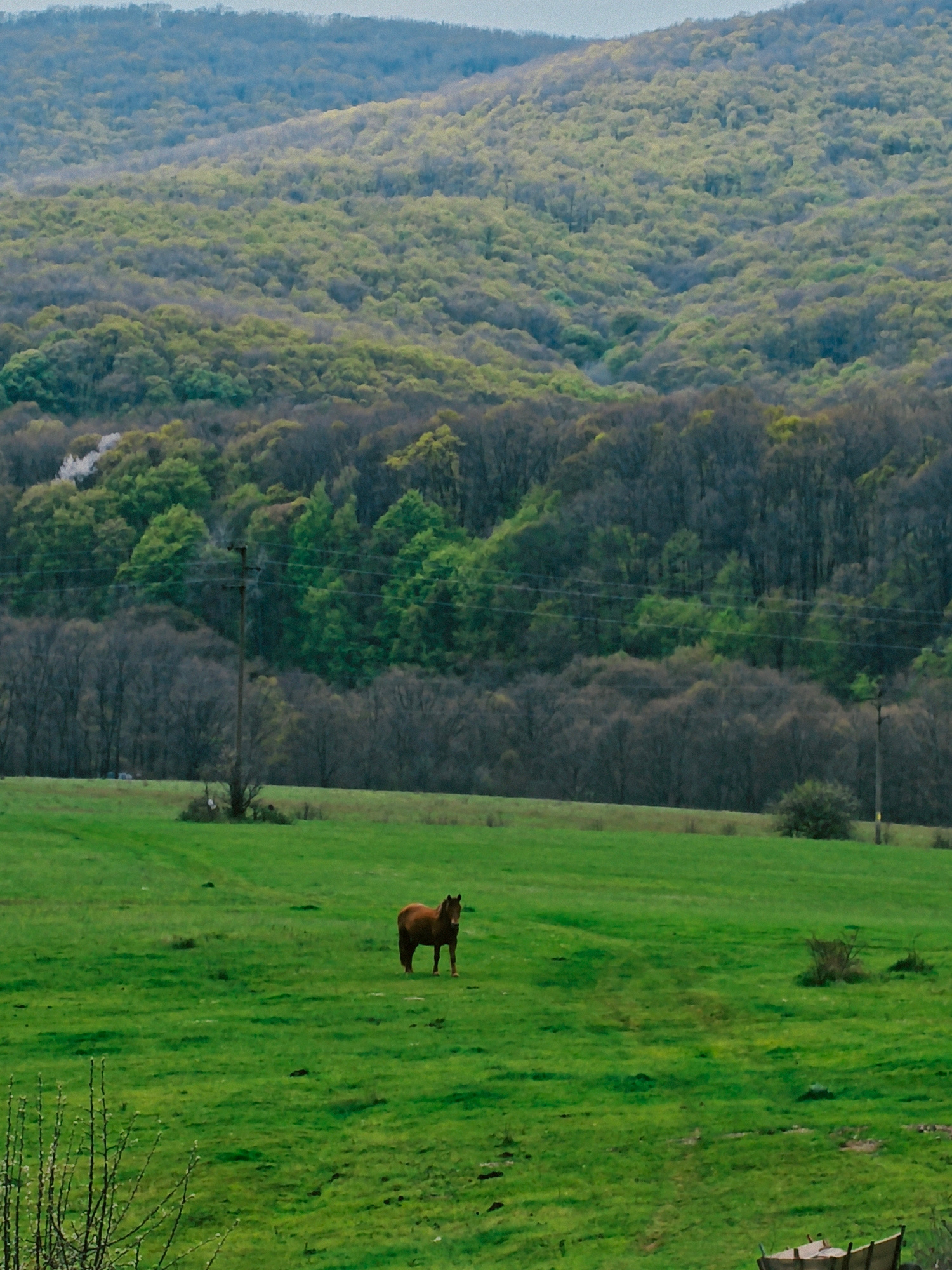 The image depicts a rural scene in or near Izgrev, Bulgaria. In the foreground, a green field stretches toward a line of trees. A single brown horse stands in the field. In the midground, a line of tr…read more