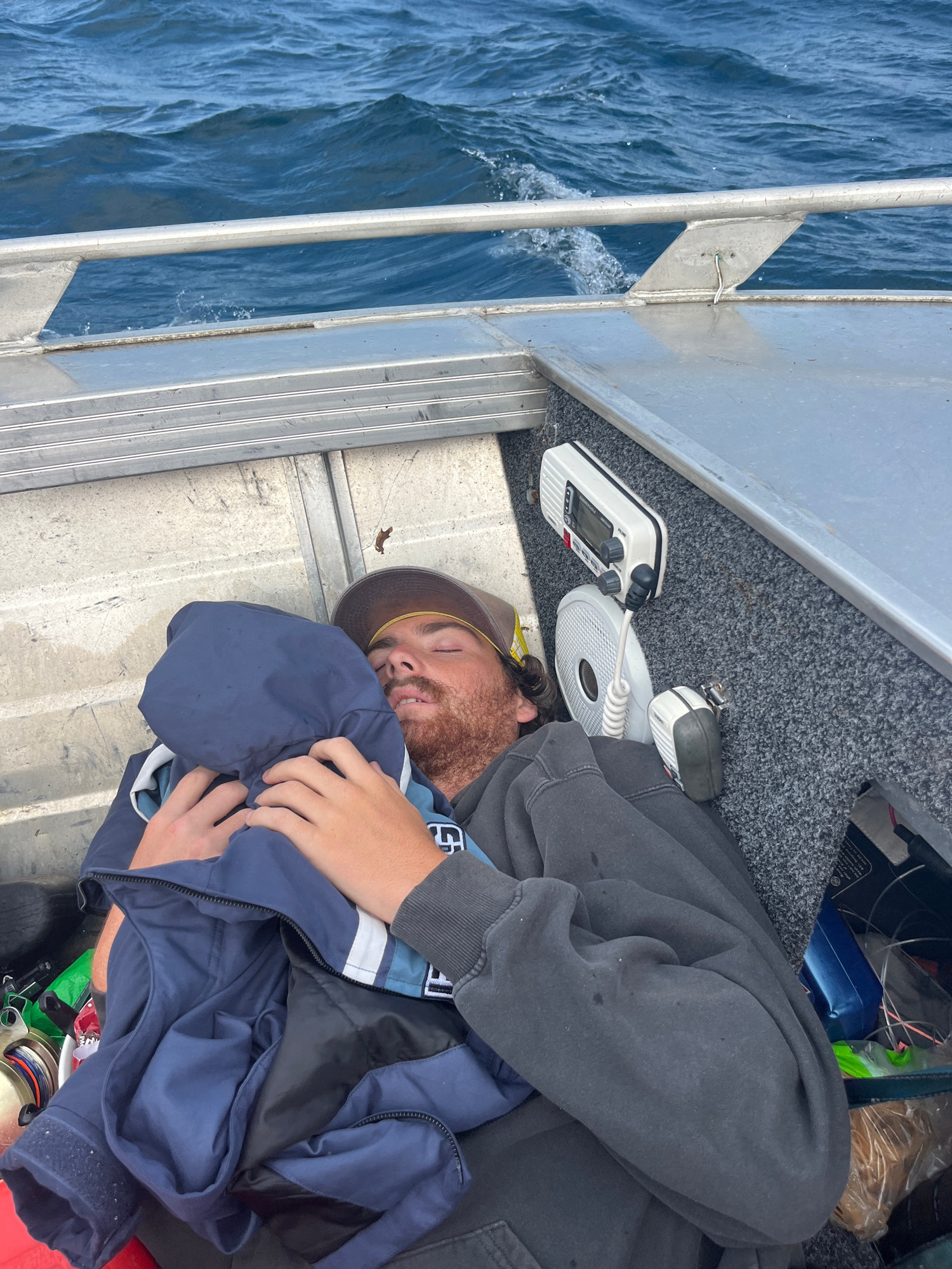 A man wearing a brown hat and a dark-colored sweatshirt is asleep on the floor of a boat. He is hugging a blue jacket. Next to his head is a marine radio and speaker. Outside the boat, water is visibl…read more