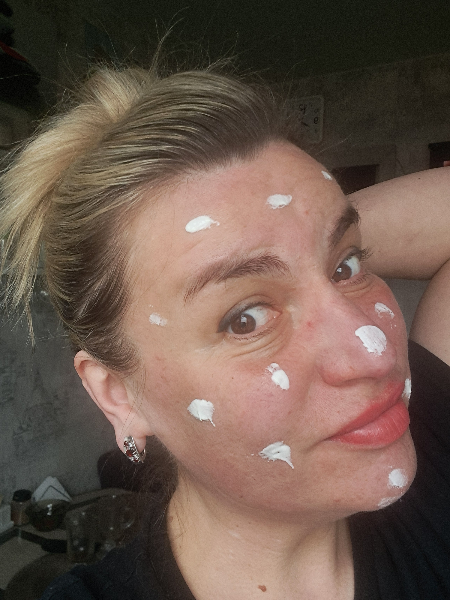 A woman with blonde hair pulled back in a low ponytail and red lipstick is looking upwards. Her skin has multiple white spots of cream or lotion on her forehead, cheeks, and neck. She is wearing a sil…read more