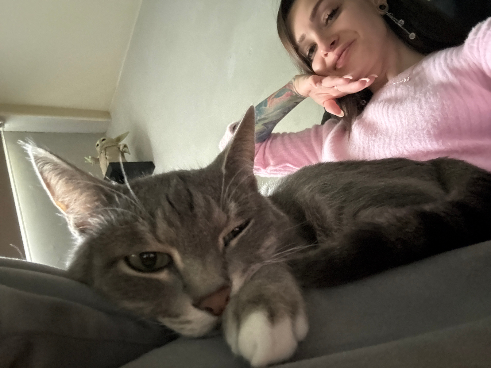 This indoor image from Reutov, Russia, features a woman and a grey tabby cat in a close-up, low-angle perspective. In the foreground, a large grey tabby cat rests, its head tilted towards the viewer.…read more