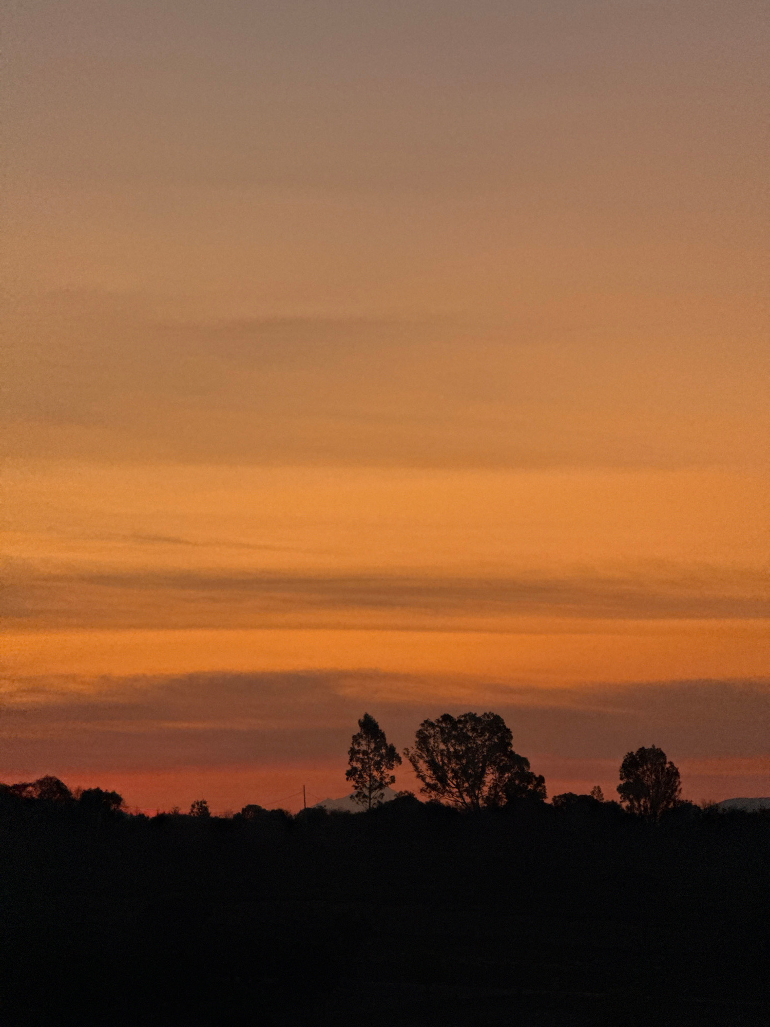 The image displays a serene landscape at either sunrise or sunset, characterized by a dramatic sky and a silhouetted foreground. The sky, occupying the majority of the frame, presents a vibrant gradie…read more