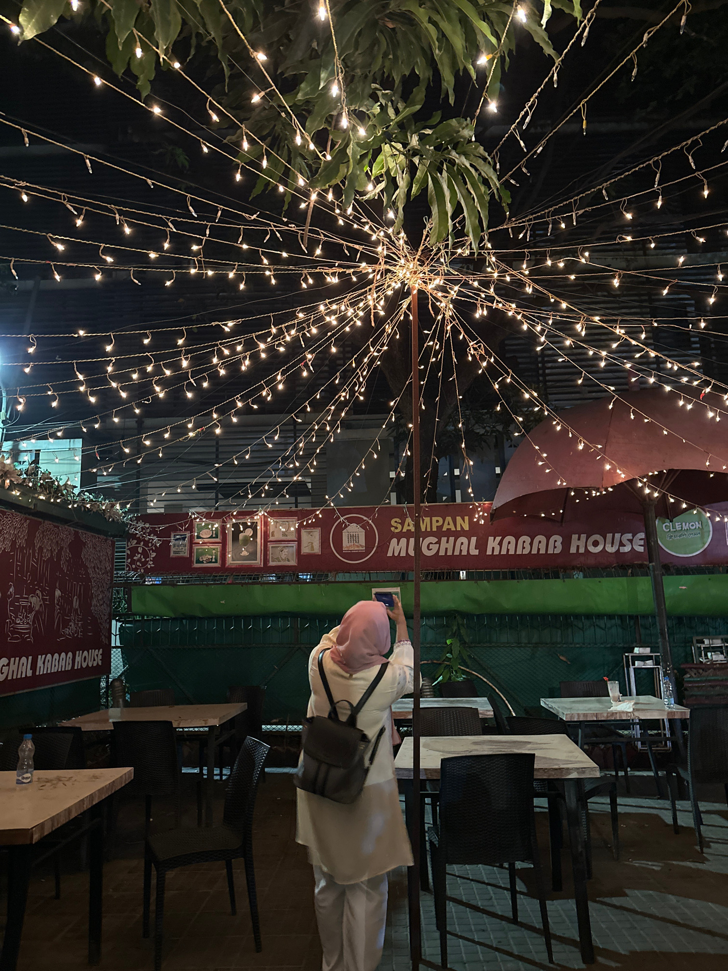 The image shows an outdoor dining area in Dhaka, Bangladesh at night. A woman in a light-colored outfit and a pink headscarf is looking at her phone. She stands near a table with black chairs. Above,…read more