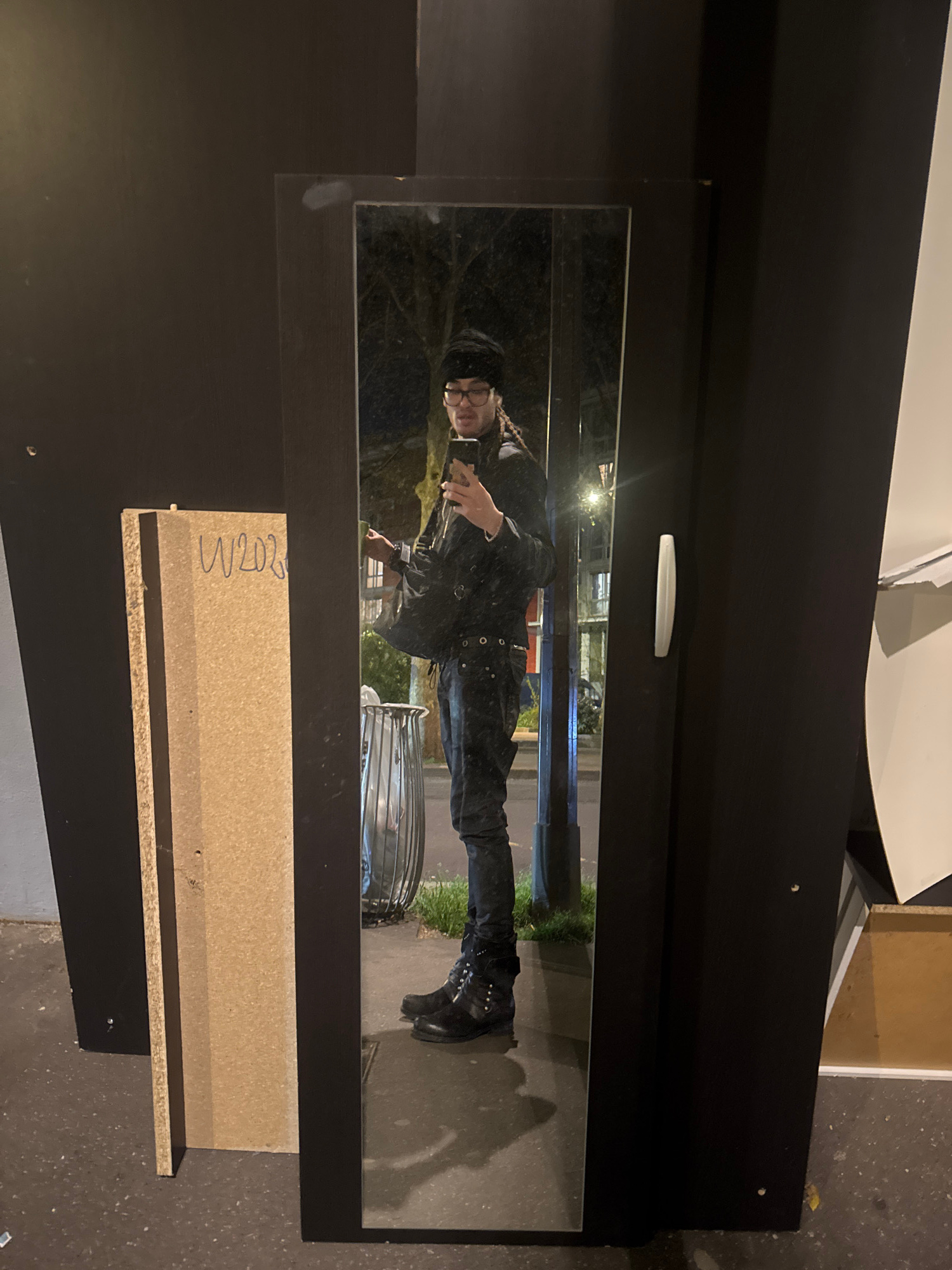 The image shows a person reflected in a mirrored wardrobe door. The person is wearing a black hat, glasses, black jacket, and black boots. The reflection reveals a city street scene with trees, buildi…read more