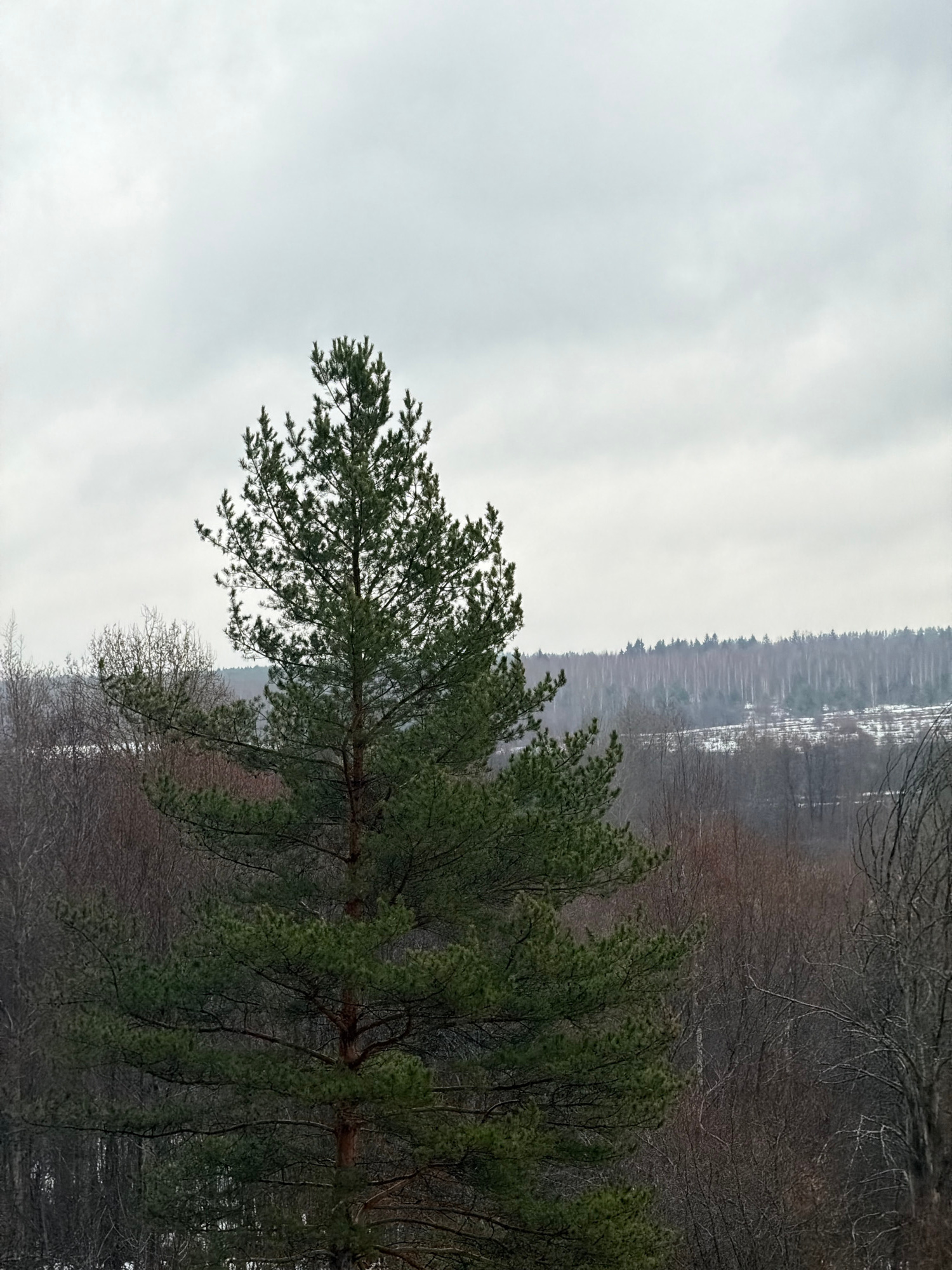 The image shows a wintry scene, likely near or within a forested area. In the foreground, there are evergreen trees, possibly pine trees, with visible green needles. In the midground, there's a landsc…read more