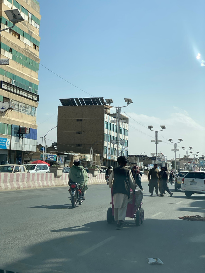 This image depicts an urban street scene in Kandahar, Afghanistan. The view is from a vehicle, looking down a multi-lane asphalt road under a clear, bright blue sky with a visible sun glare in the upp…read more