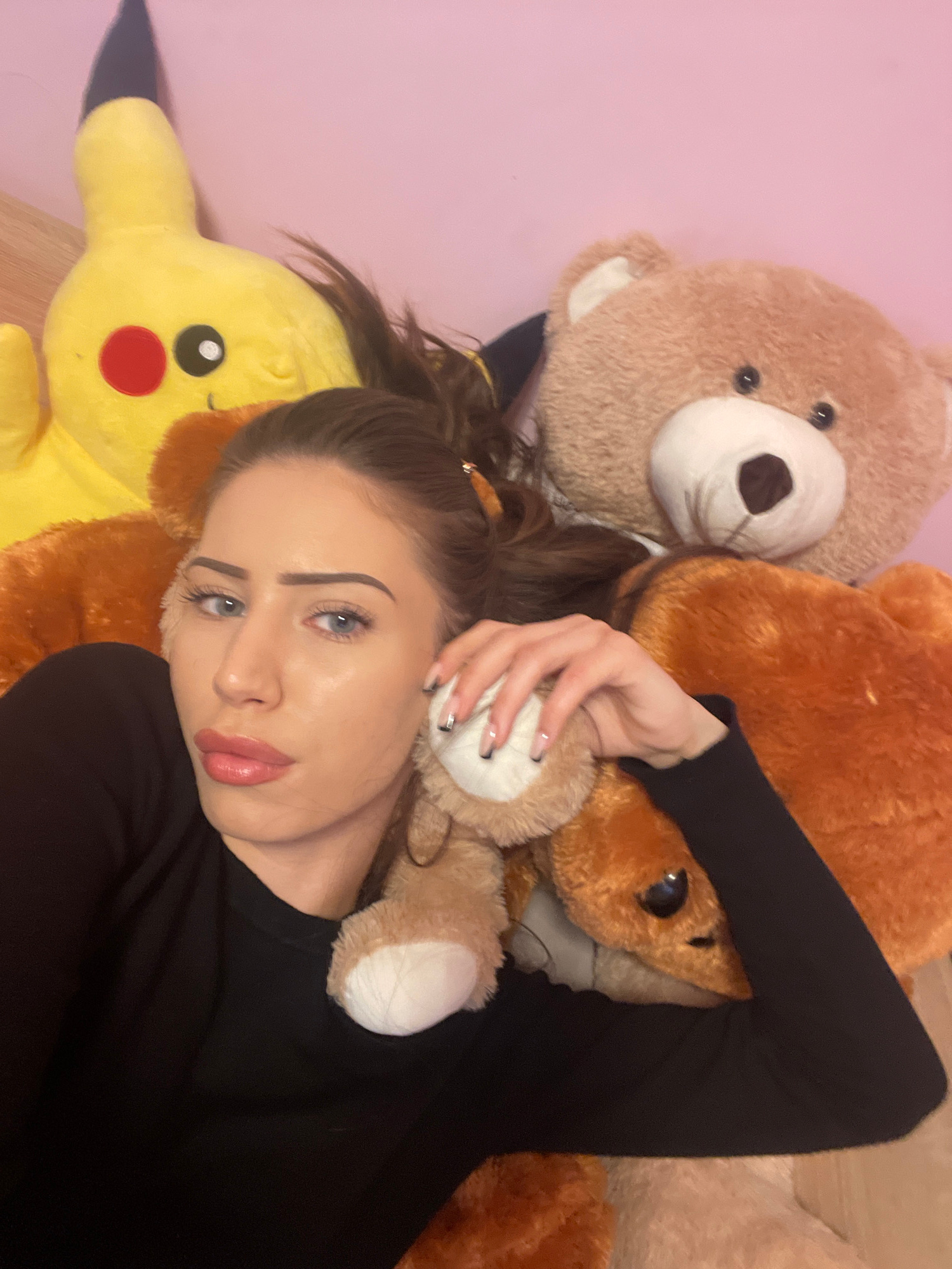 A woman lies among stuffed animals, including a Pikachu and several teddy bears. The background is a plain, light pink wall. She wears a black long-sleeved shirt. The location is Somovit, Bulgaria.