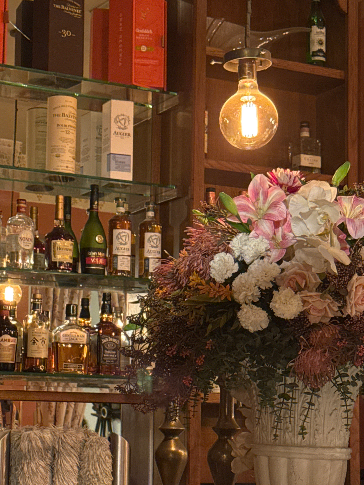 The image shows a bar shelf in what appears to be a restaurant or lounge, possibly located in Tel-Aviv, Israel (due to the Hebrew writing on one of the bottles, “余市”). The shelves are made of glass, d…read more