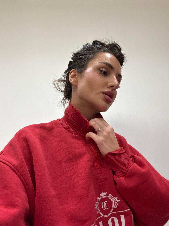 A woman with slicked-back dark hair is seen from a low angle, glancing upward with a serious expression. She wears a bright red, collared sweatshirt with a white crest design. Her hand is near the col…read more