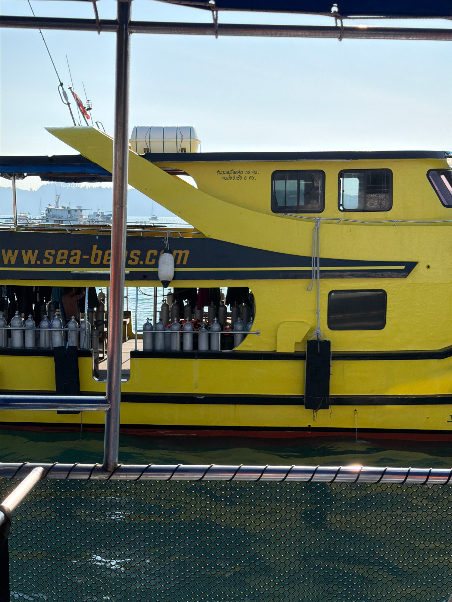 The image displays the port side of a large dive boat, predominantly yellow with black accent stripes, moored in the waters of Rawai, Thailand. The partially visible website address "www.sea-be s.c m"…read more