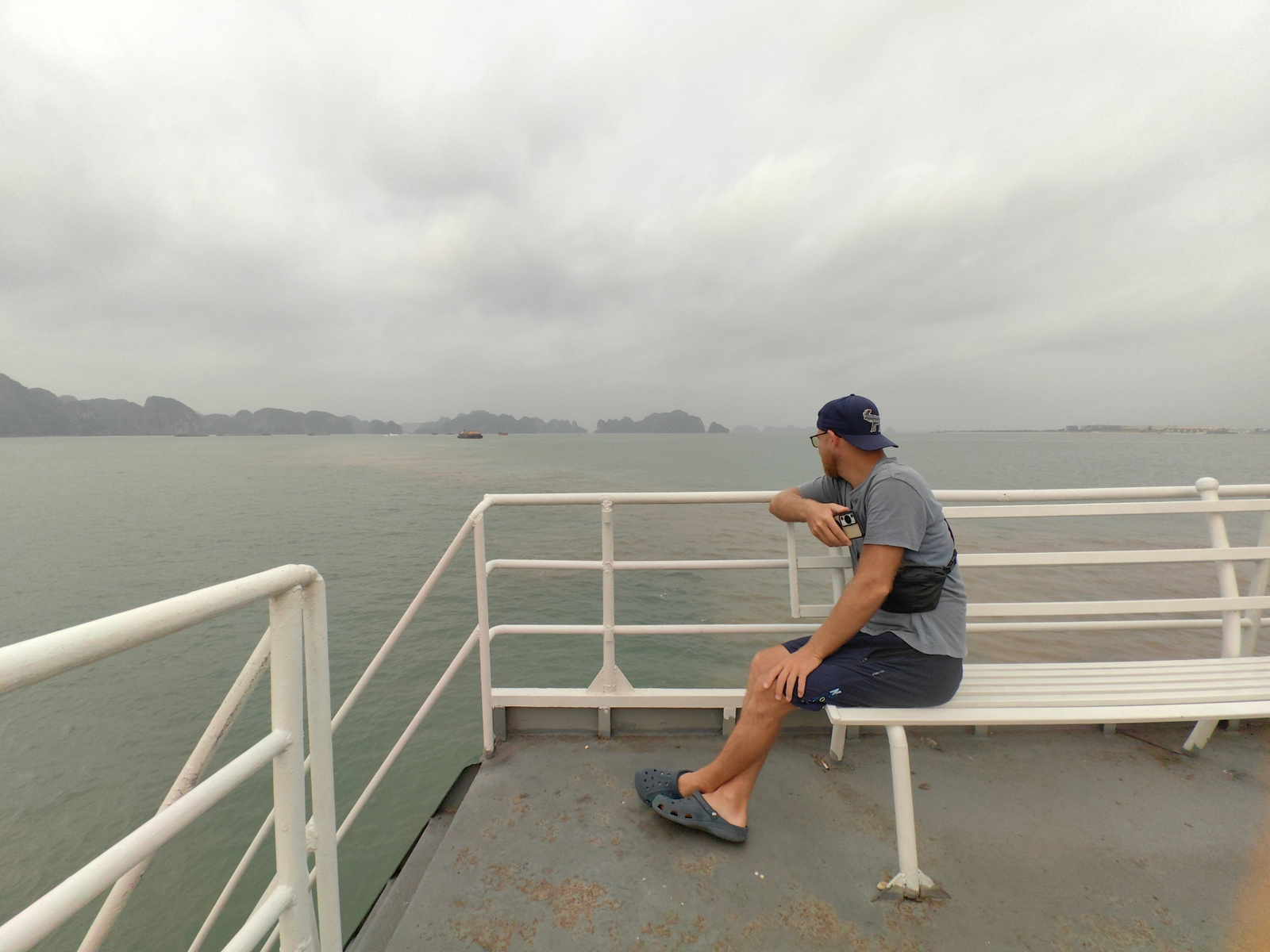 A wide-angle shot taken on what appears to be a ferry in Ha Long Bay, Ha Long Ward, Vietnam on a cloudy day. A Caucasian man wearing a baseball cap, glasses, grey t-shirt, blue shorts, and grey Crocs…read more