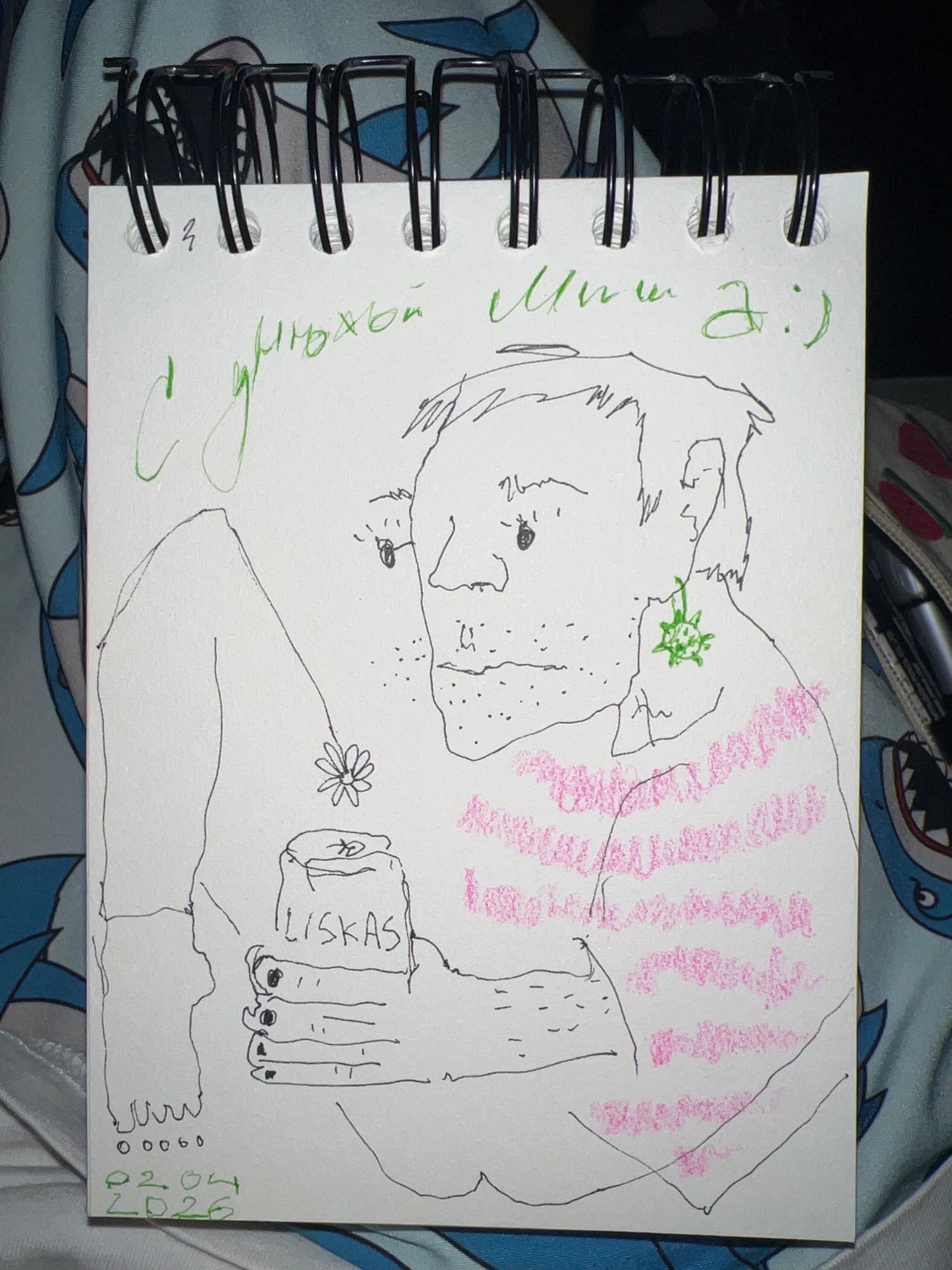 The image is a drawing on a notepad, featuring a stylized sketch of a person, along with some handwriting in green and pink. The notepad has a black spiral binding on the left side. The person depict…read more